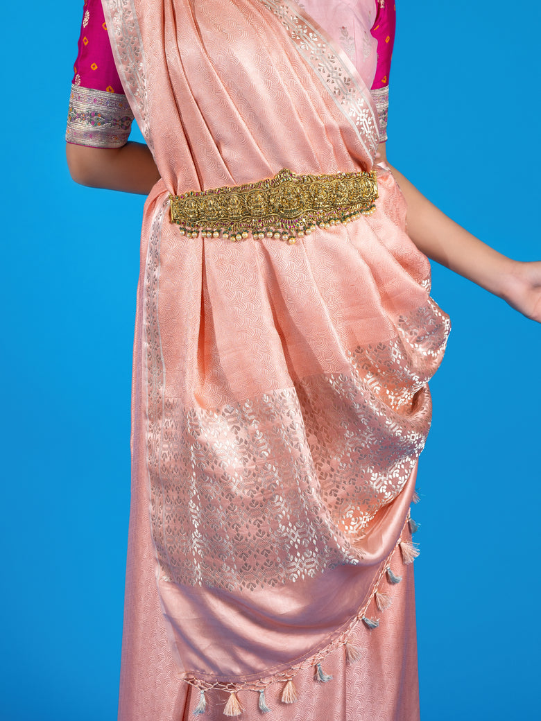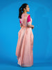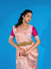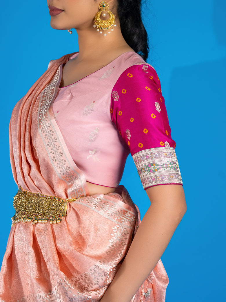 Fusion light-pink silk blouse features an intricate design of gold zari floral buttis, paired with a contrasting bandhani and banarasi zari border.