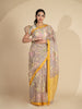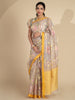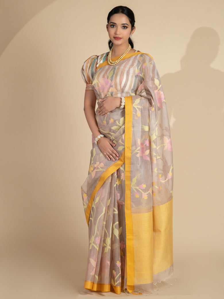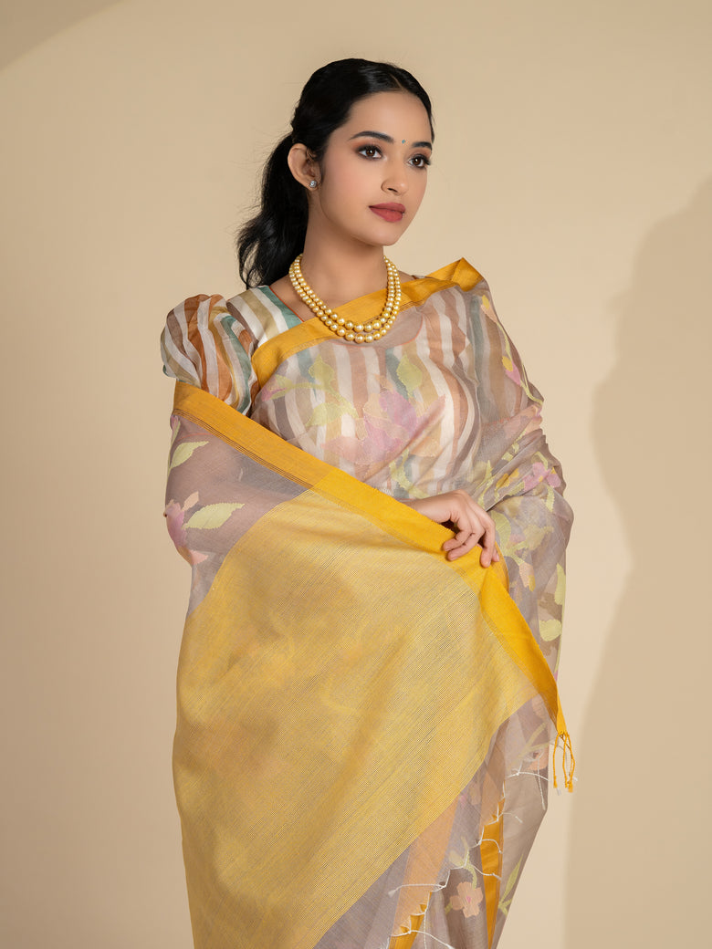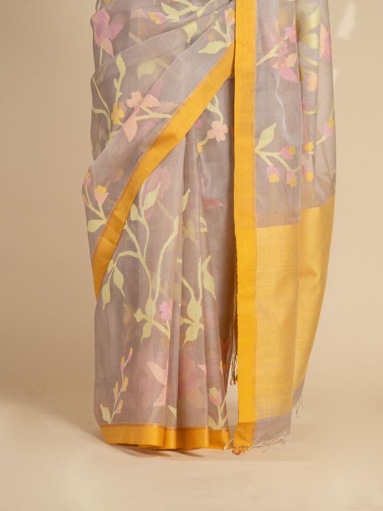 This muslin jamdani saree features a multi-coloured floral jaal weaving throughout, accompanied by a contrasting plain border and a thread work pallu. Along with the saree, you will also receive an unstitched blouse piece in a contrasting colour, featuring a plain design with a border embellished with thread work.