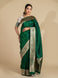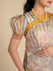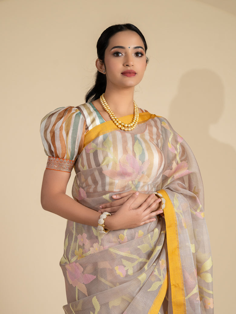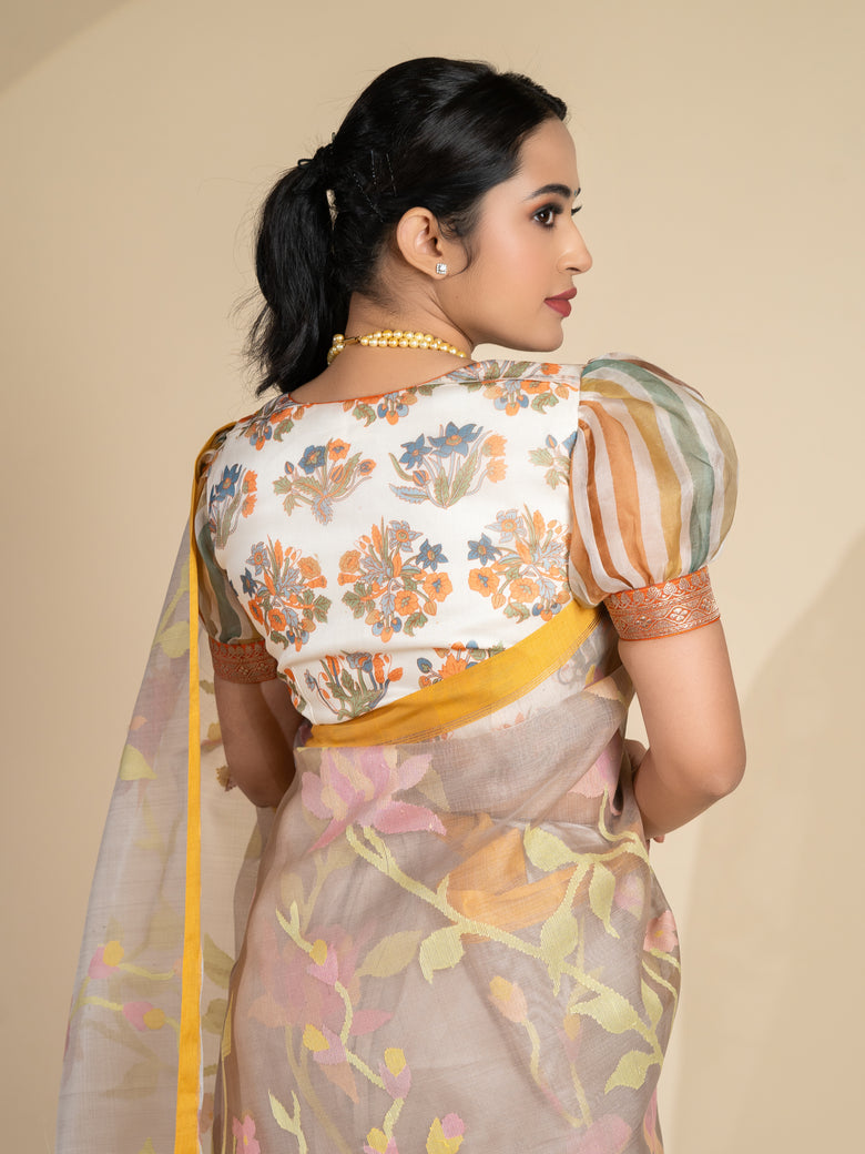 This fusion organza blouse features an intricate front design with multi-color stripes and a floral print on the back. The self-striped sleeves are accentuated with a banarasi border, adding a touch of elegance to the overall look.