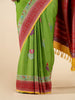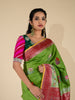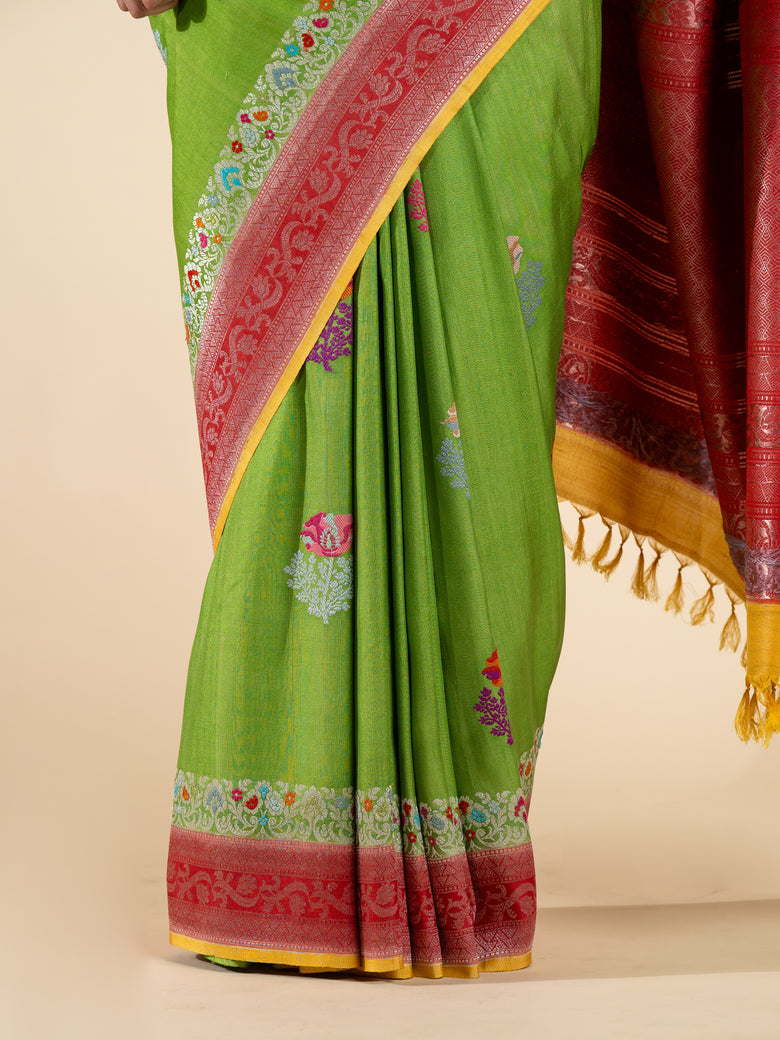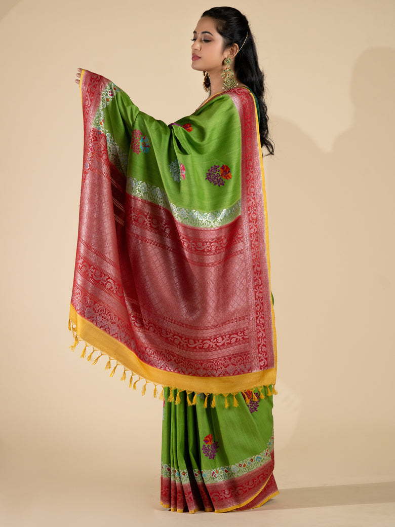 Tussore georgette saree features an all-over weave of meenakari floral buttis, accented with a contrast silver zari floral border and brocade pallu. the saree is green in color and includes an unstitched blouse with a contrasting, plain design and border.