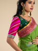 Fusion banarasi silk blouse features a bottle-green color, adorned with intricate gold zari floral buttis. The contrast leheriya pattern and border add a touch of elegance to the overall design.