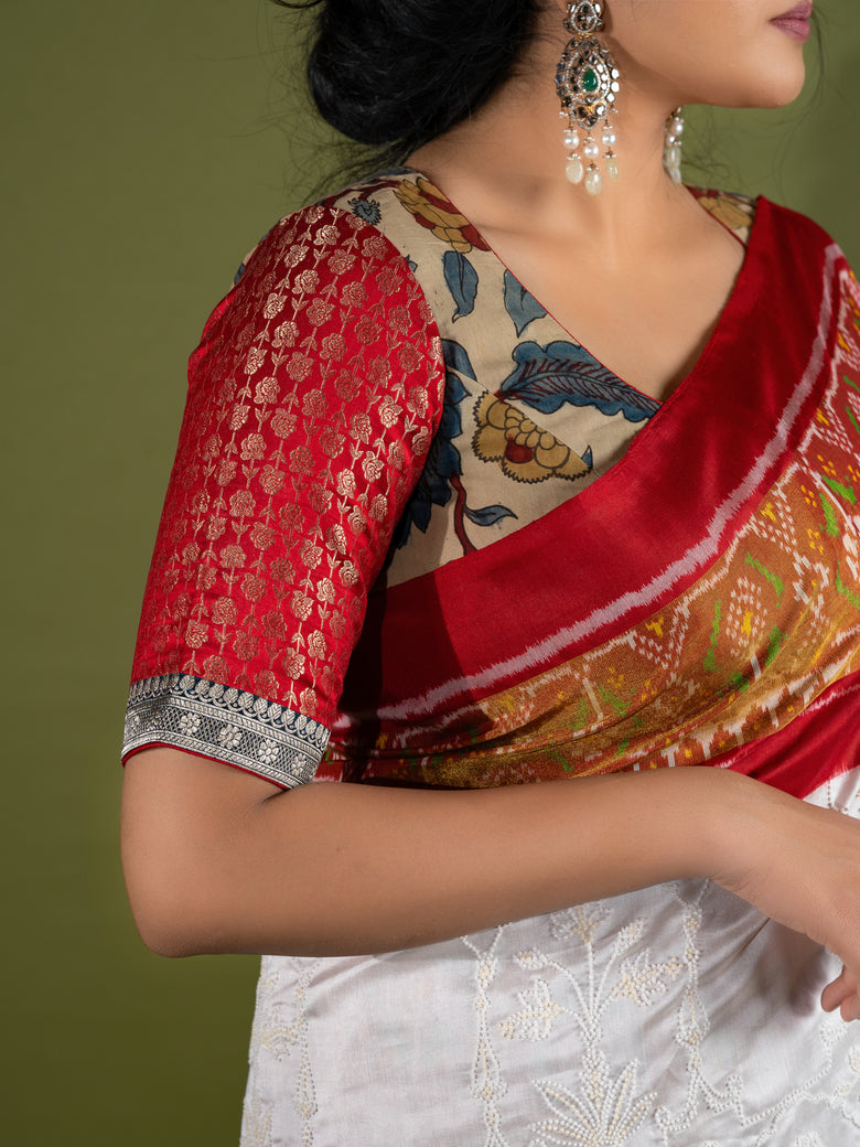 This fusion kalamkari blouse features a beige color and elegant woven kalamkari designs, accompanied by contrasting banarasi sleeves.