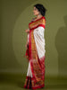 Patola saree features intricate floral french-knot embroidery throughout, complemented by a contrasting tissue floral border and pallu. The color white adds to its elegance. Additionally, you will receive an unstitched blouse in a contrasting, plain design with a border.