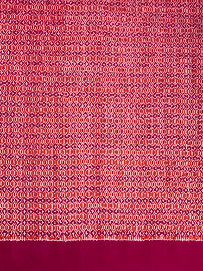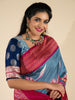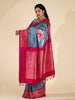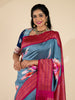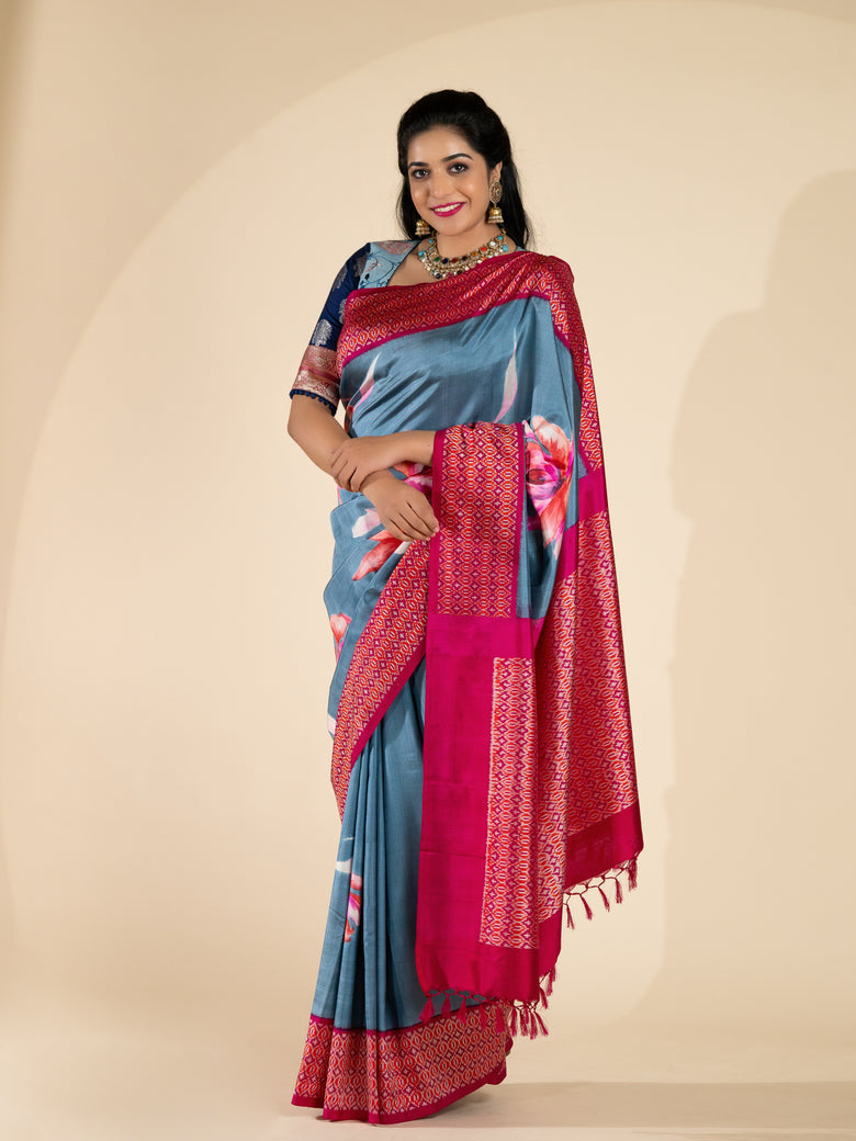 This blueish-grey Ikat brush painted saree features a weave all over brush painted floral pattern and a contrast ikat design border and pallu. Included is an unstitched blouse with a complementary ikat design.
