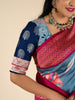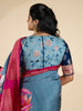 Fusion of linen cotton and banarasi, this blouse features a light blue hue with intricate floral embroidery. The contrast banarasi sleeves are adorned with a border, creating a stunning and unique look.