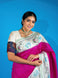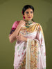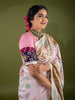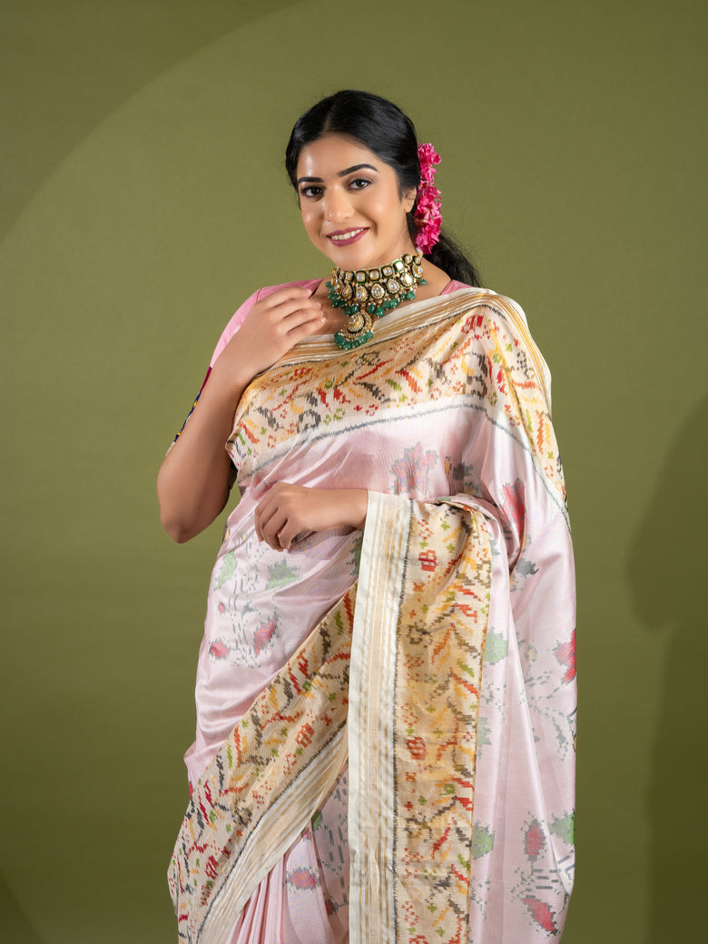 Patola saree features an intricate, all-over weave of floral buttis as well as a self tissue floral border and pallu. The stunning light-pink color adds to its appeal. Plus, an unstitched blouse in a contrasting, plain design with a border is included.