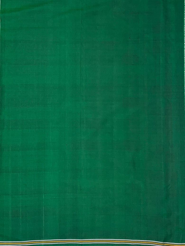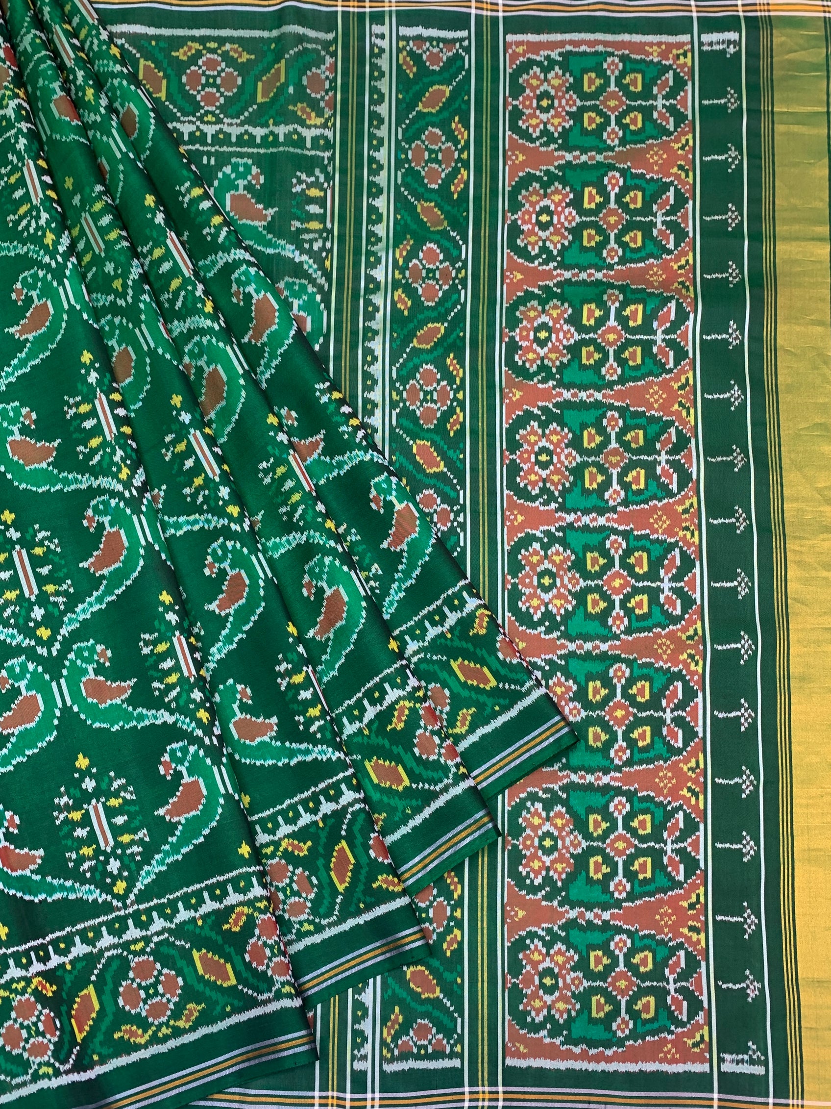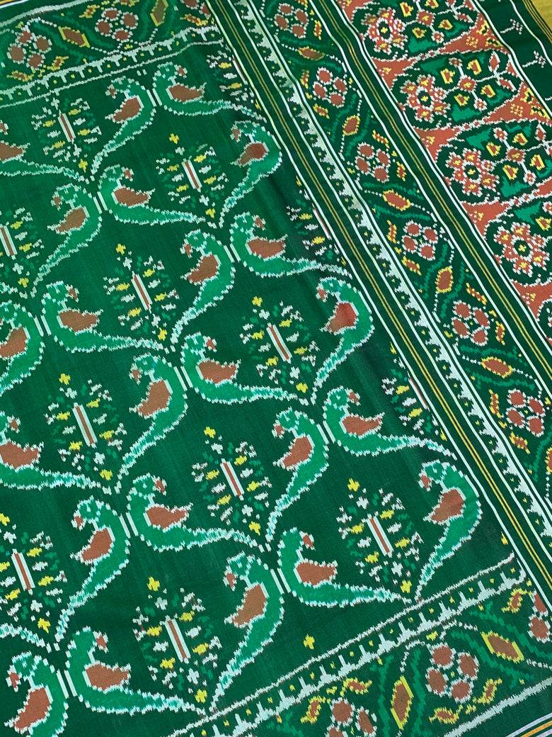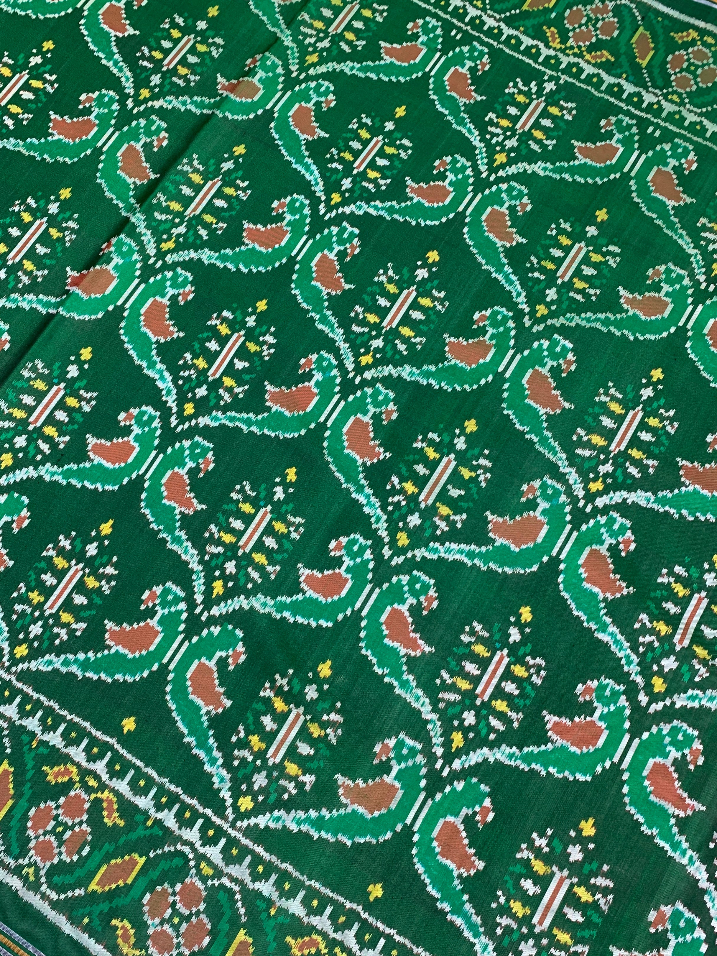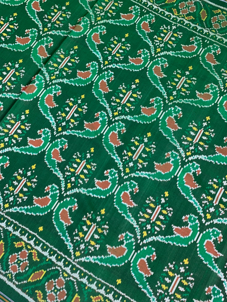 This bottle-green Patola saree is adorned with intricate self parrots motifs and delicate floral patterns, creating a harmonious and traditional design. It features a subtle self floral border that complements the elegant zari pallu, adding a touch of grandeur. Paired with a matching self plain blouse.