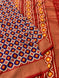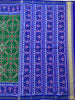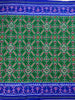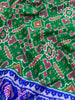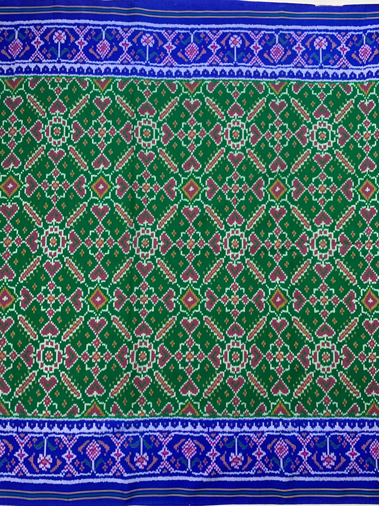 This single-ikat Patola saree exudes vibrancy with its multicoloured yarn weaving, a vivid floral-style border, and a striking dark-green pallu. Its bold colour is further complemented by a simple blouse with contrasting trim details.