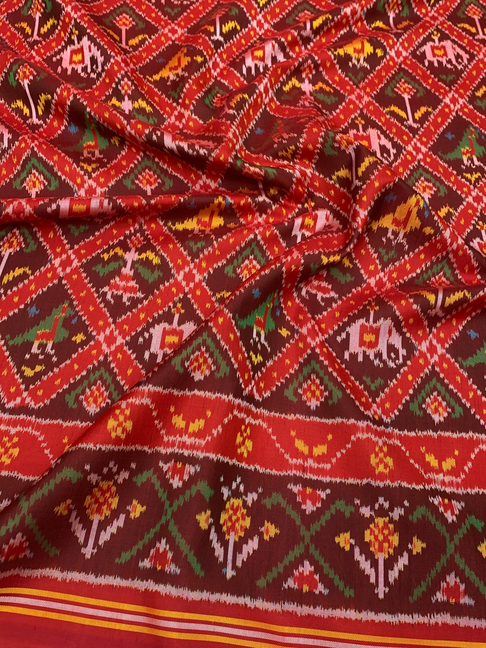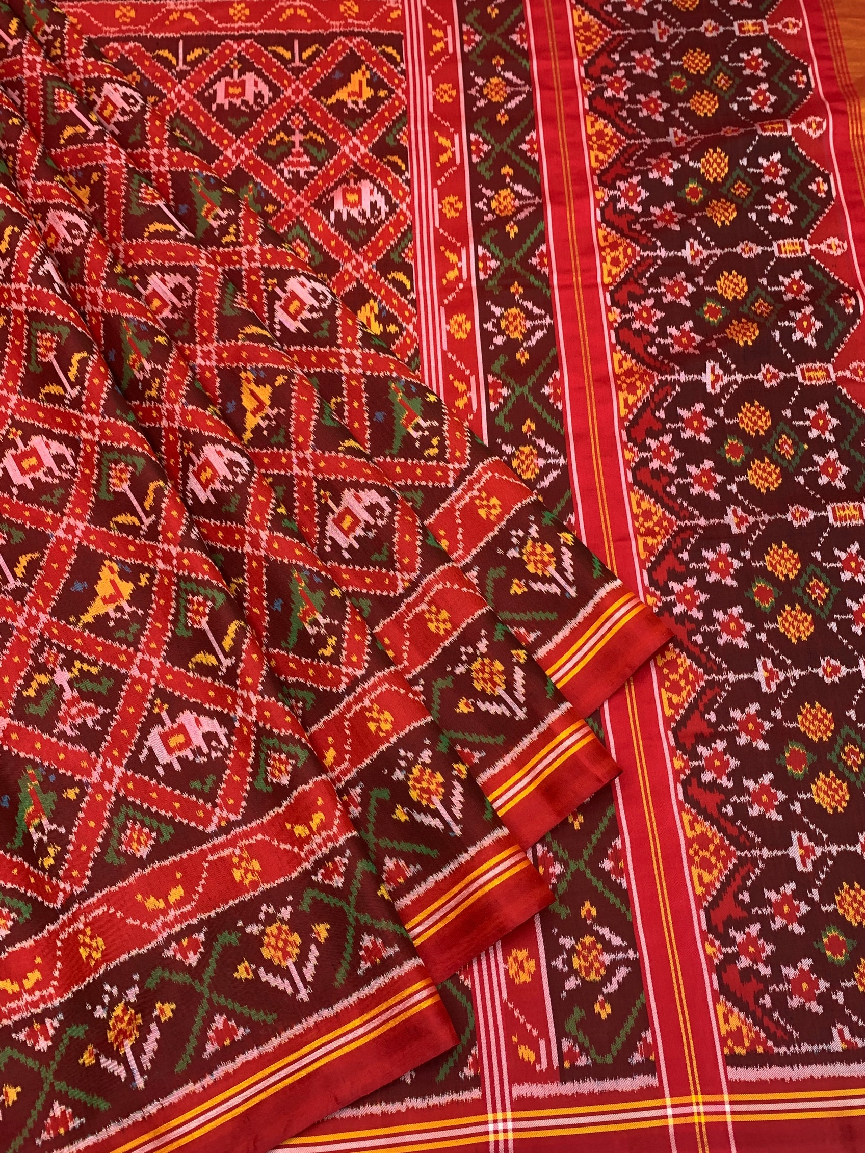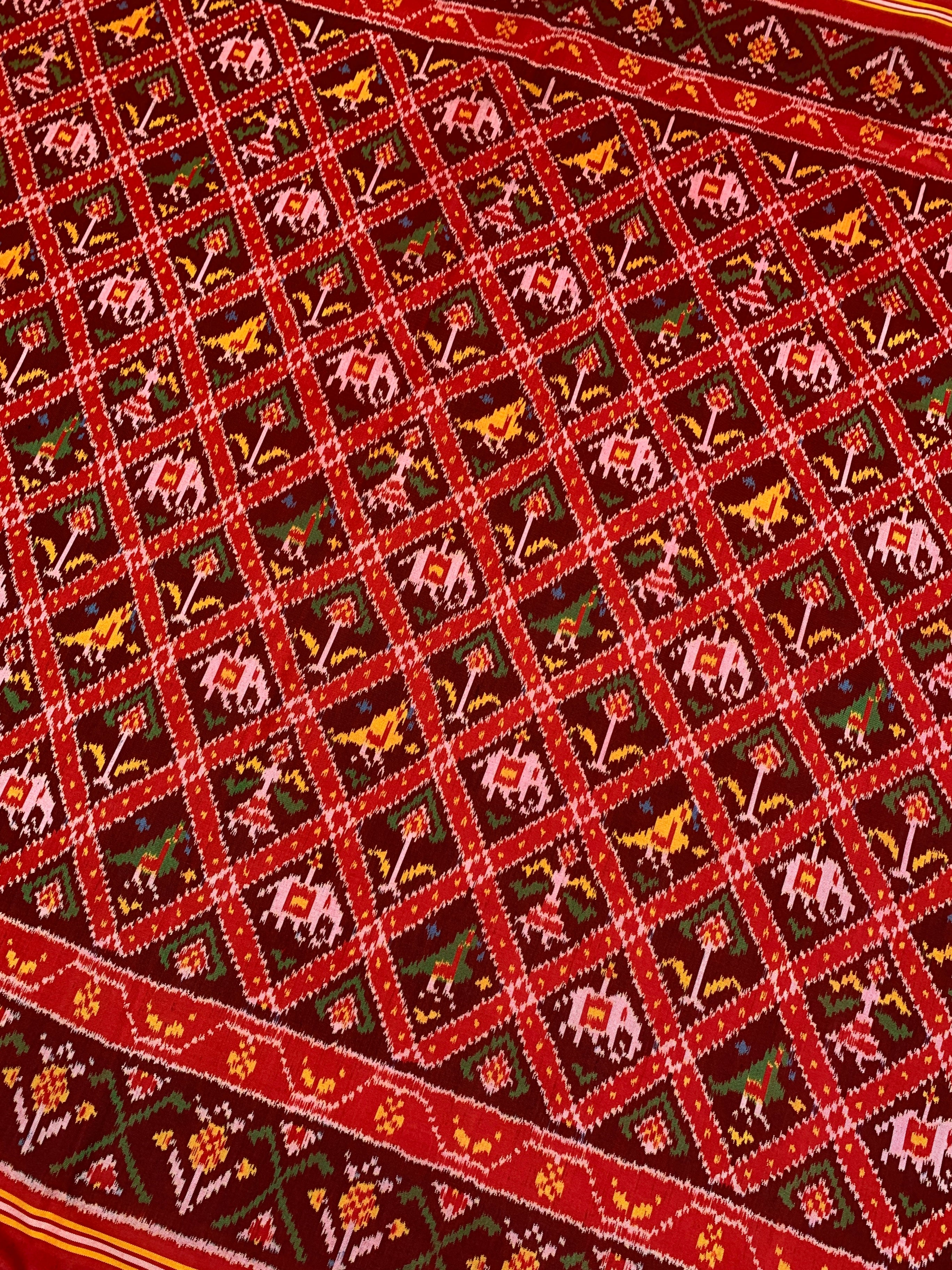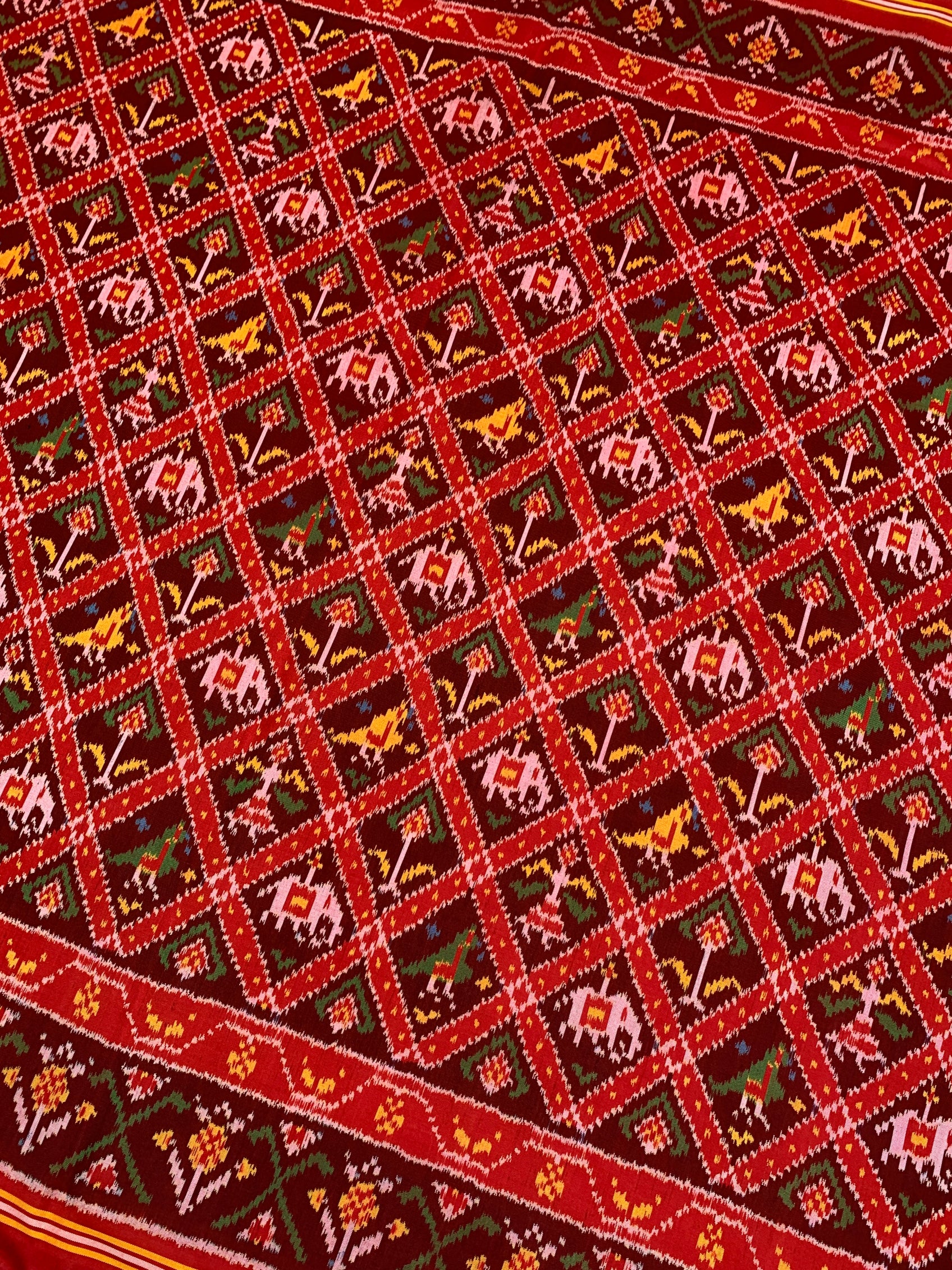 This dark-maroon Patola saree features intricate animal and floral motifs covering the entire fabric, complemented by elegant geometric patterns. It is finished with a self-floral border and a zari pallu in a contrasting red shade. The accompanying blouse is plain red with a striped border.