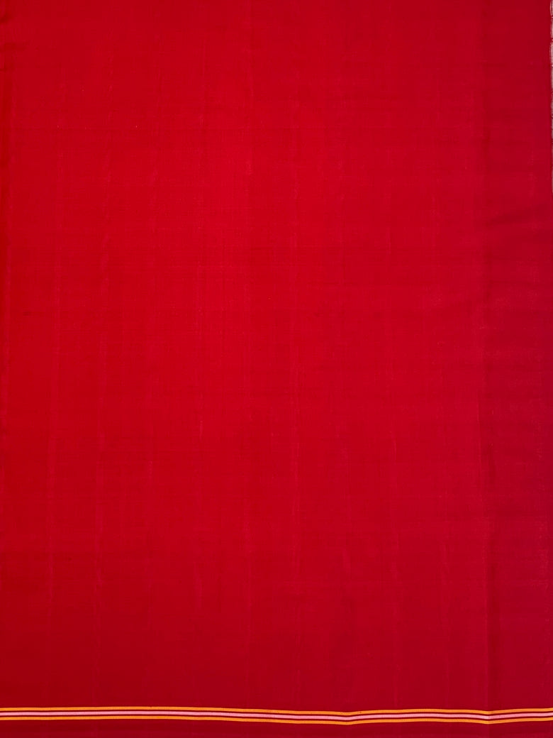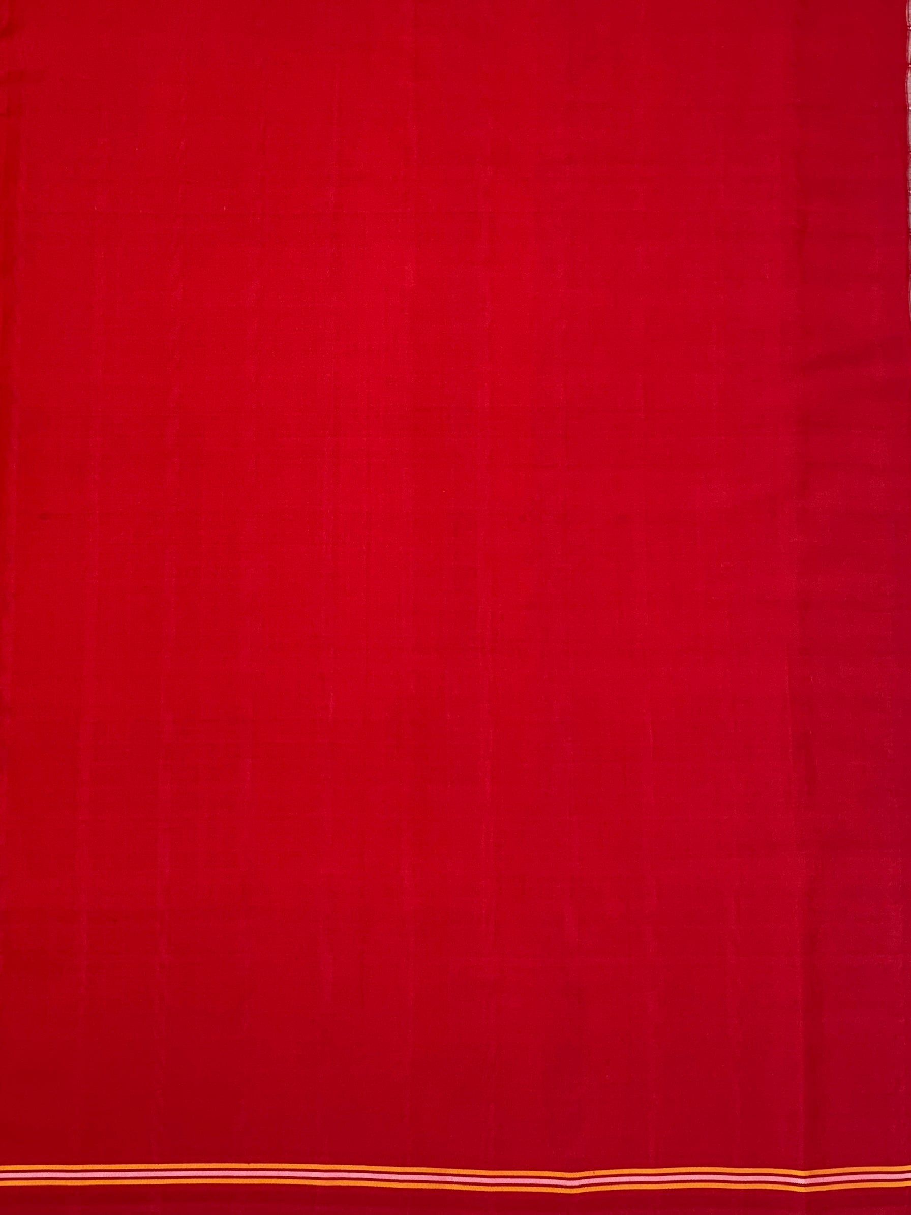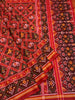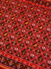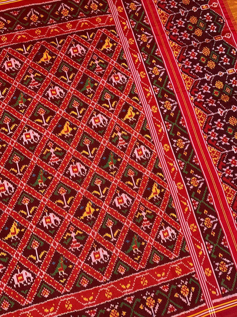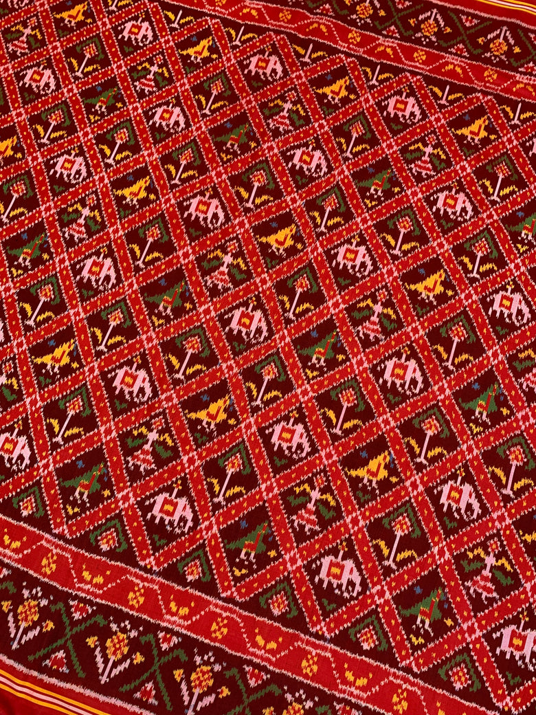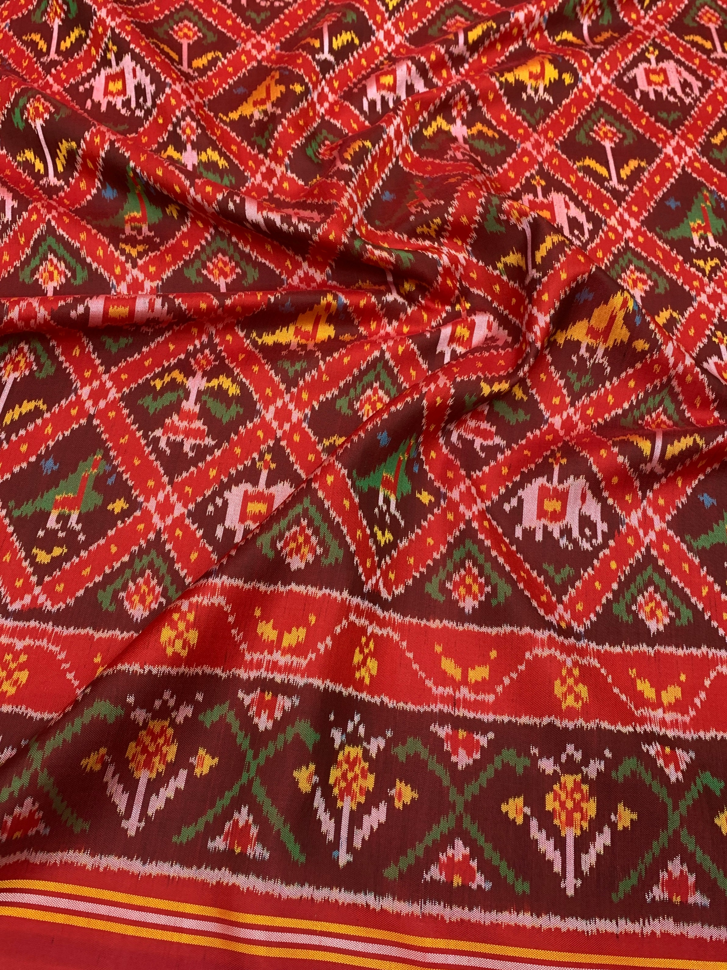 This dark-maroon Patola saree features intricate animal and floral motifs covering the entire fabric, complemented by elegant geometric patterns. It is finished with a self-floral border and a zari pallu in a contrasting red shade. The accompanying blouse is plain red with a striped border.
