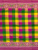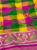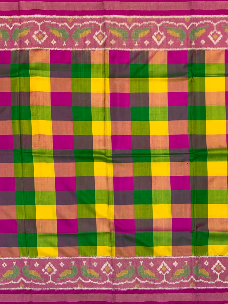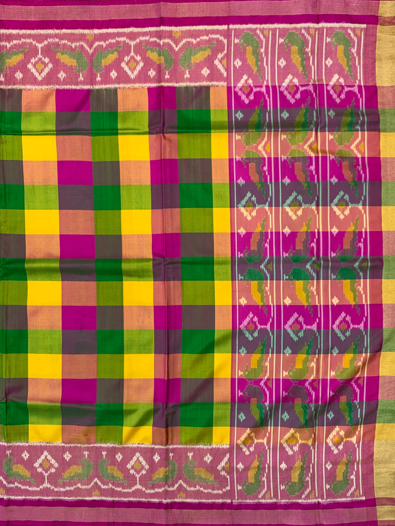 This Patola saree features a multi-colour checked pattern throughout, accompanied by a contrasting tissue border and pallu with bird motifs. The accompanying blouse also boasts a multi-colour design with border details.