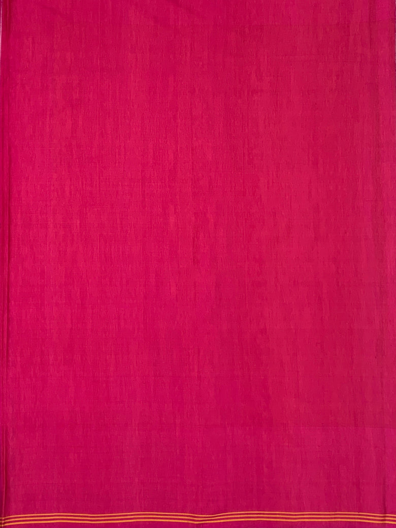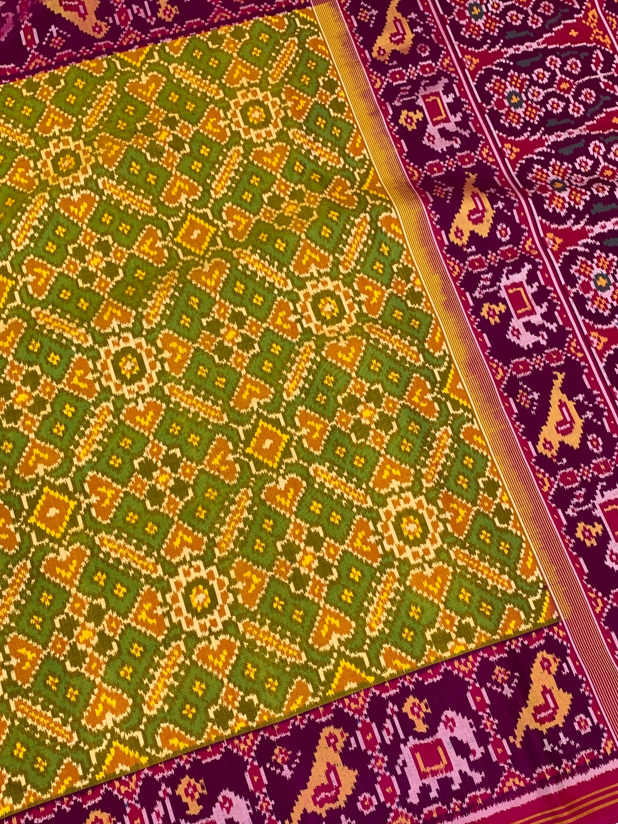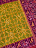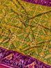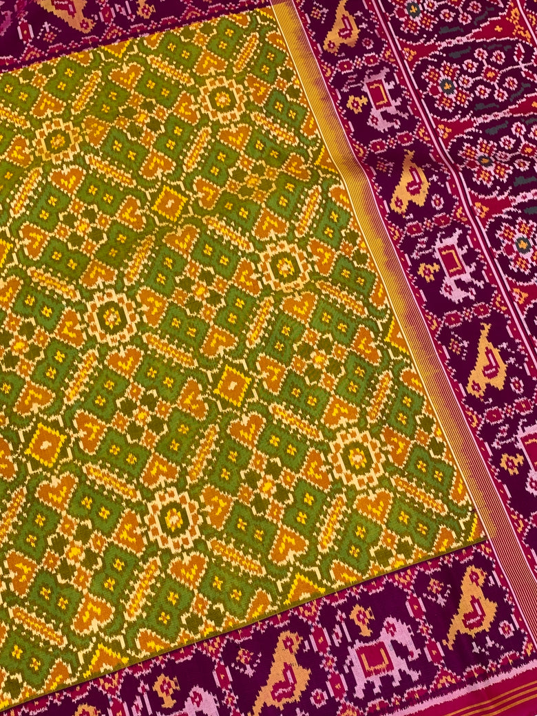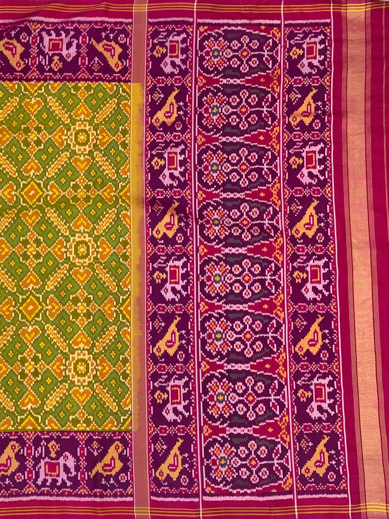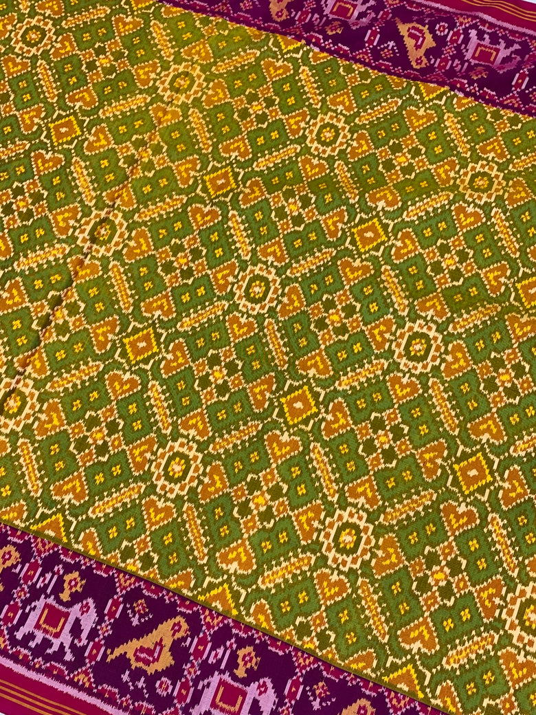 This golden Patola saree features an intricate multi-coloured Navaratan pattern throughout, with green as the secondary color. It is enhanced by a contrasting birds motif border and a rich zari pallu, showcasing traditional artistry. The ensemble includes a pink plain blouse with a striped border.