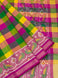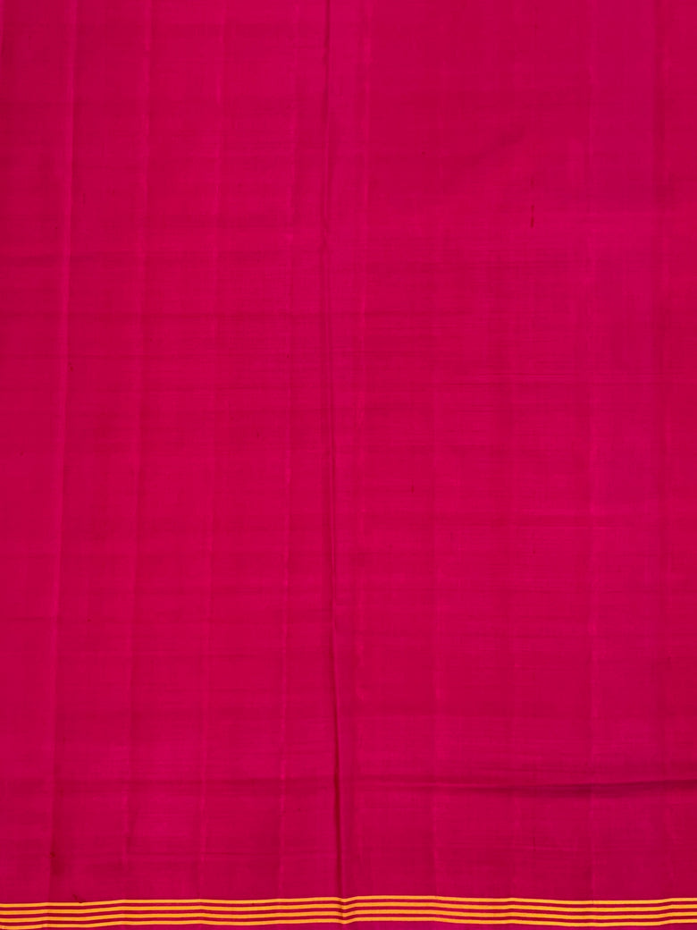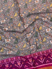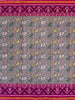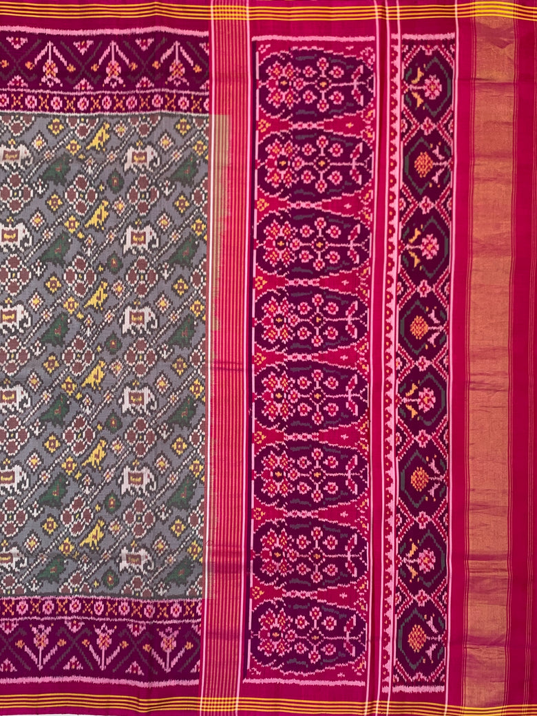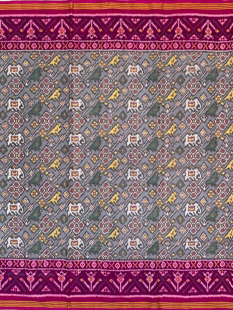 Patola saree in light-mauve showcases a stunning weave featuring floral, elephant, and bird motifs intricately patterned throughout the fabric. a contrast floral border and pallu add extra dimension to this elegant piece. the accompanying blouse features a complementary border detail, completing the overall look.