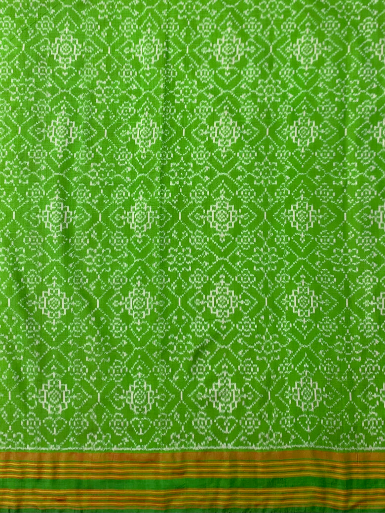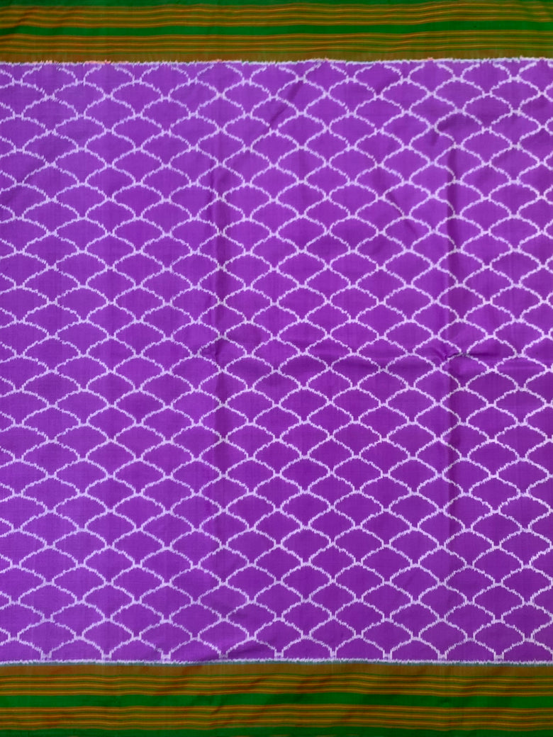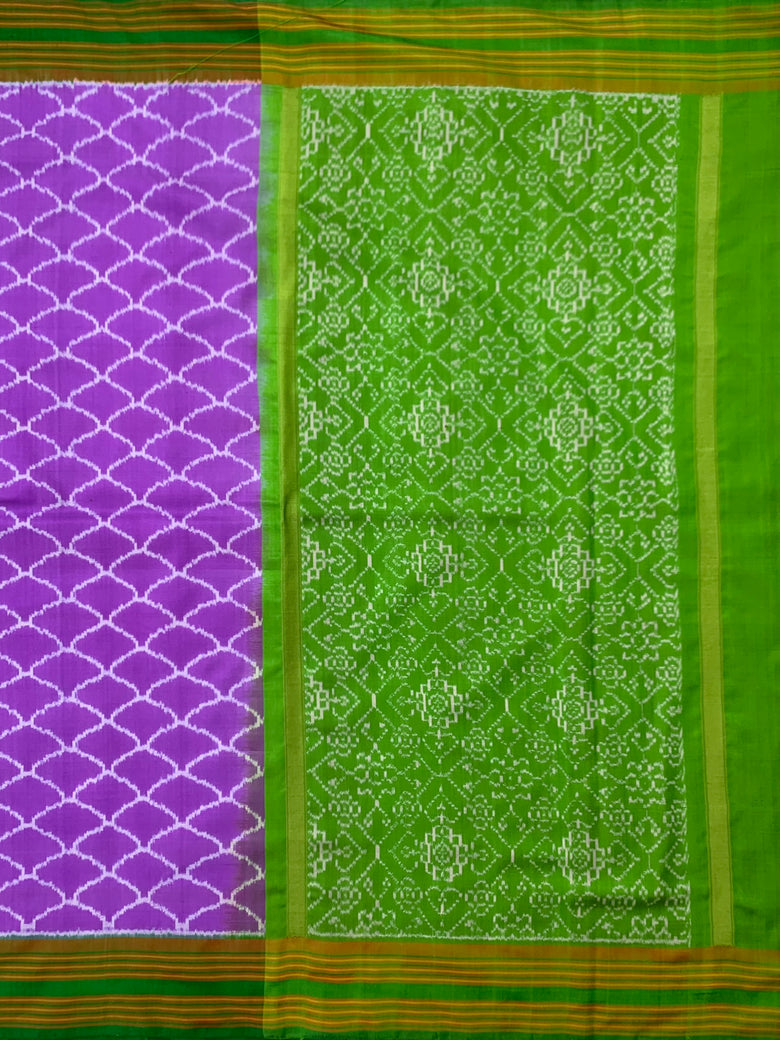 This lavender Patola silk saree features a captivating all-over geometric design complemented by a contrasting border of stripes and a floral pallu. It also comes with a blouse adorned with a floral jaal and stripes border for a stunning contrast.