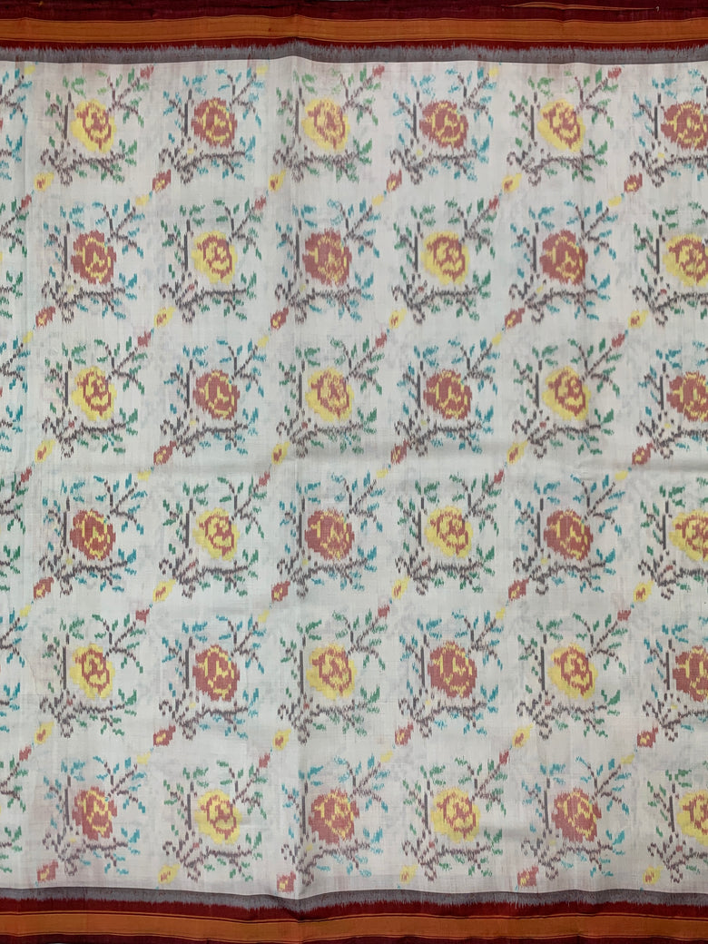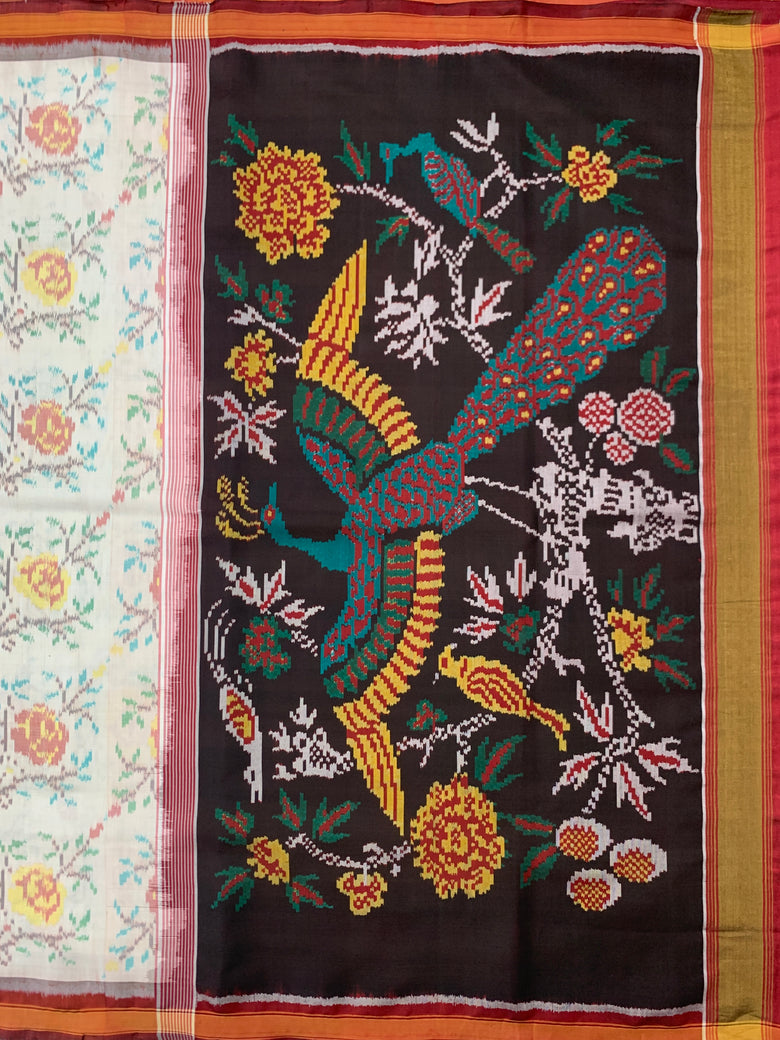 This Patola saree is crafted in white silk, decorated with a multi-hued floral pattern throughout, a contrasting kaddi border, and bird motifs on the pallu. Accompanied by a plain blouse, with a border to complete the look.