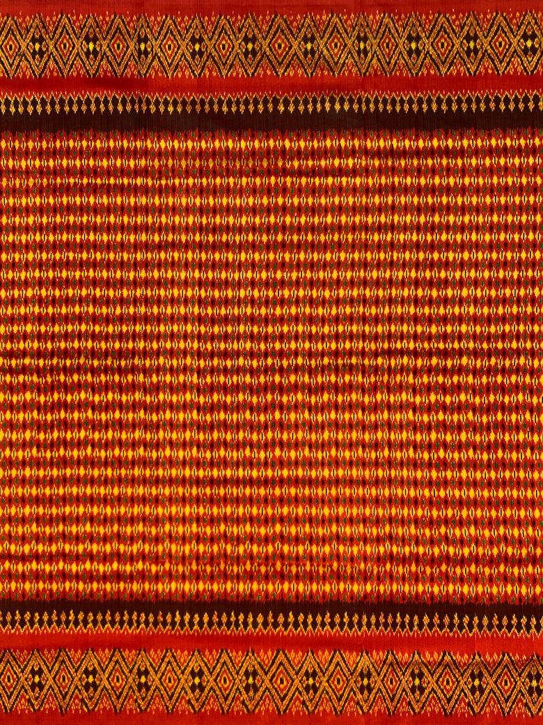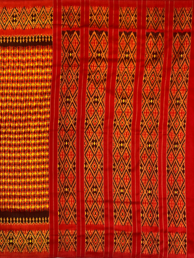 This twill patola saree features a multi-color geometric design all over its fabric, with a contrasting geometric design on the border and pallu. The color red adds a bold touch to the saree, which is completed with a plain contrast blouse.