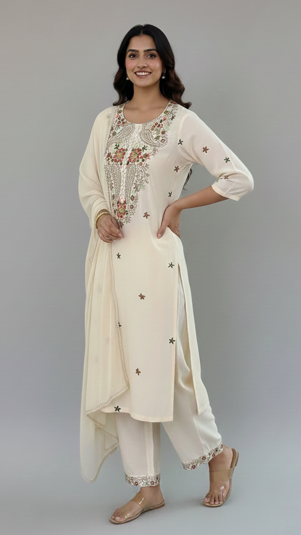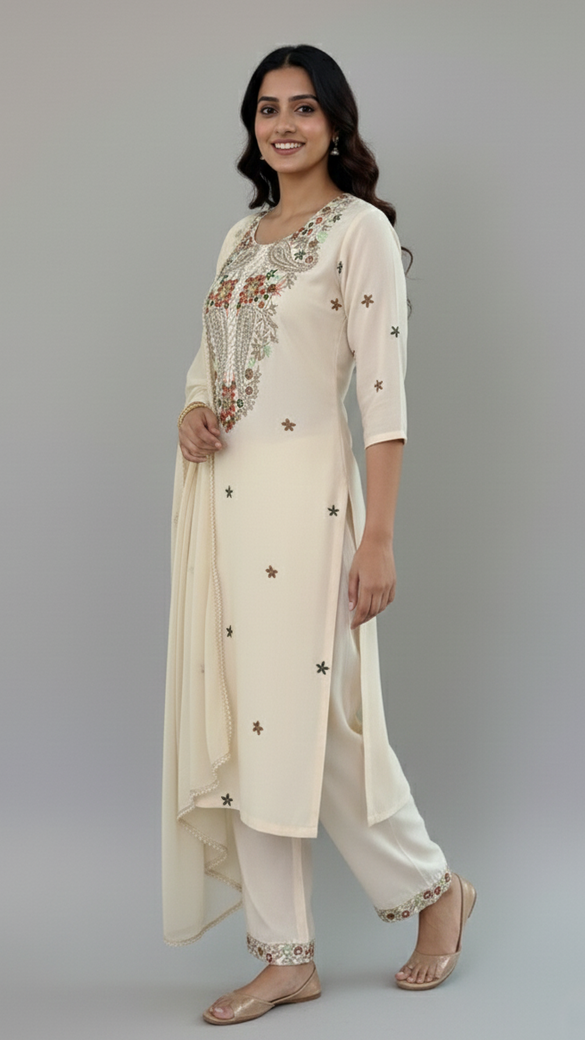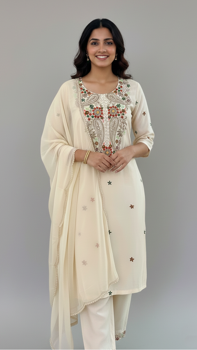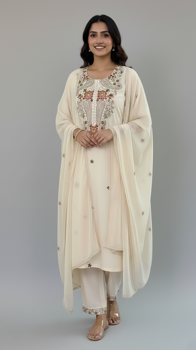 This Silk Straight Suit Set in Cream with Floral Zardozi Design, Adorned with Sequence, Pearl, and Thread Weave Buttis. Georgette Dupatta with Aari-Work, Pearl, and Sequence Work Buttis and Scallop Border.