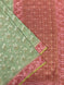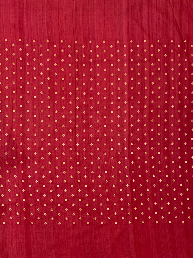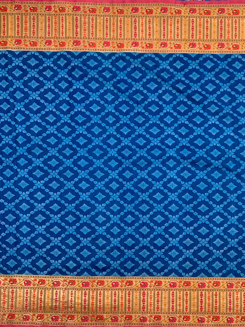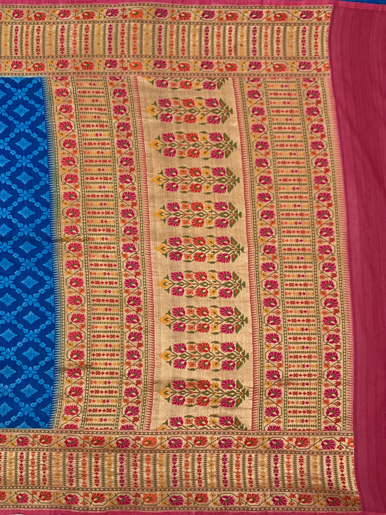 This Tussore Georgette Saree features a thread weave floral butta and geometrical pattern throughout, with a contrasting meenakari floral border and pallu. The color is timeless blue and the blouse is adorned with a contrast gold zari floral butta design.