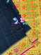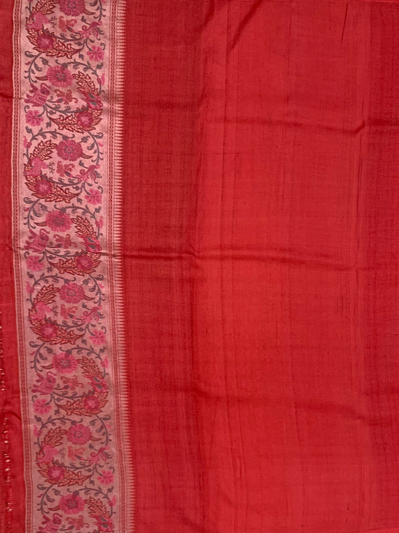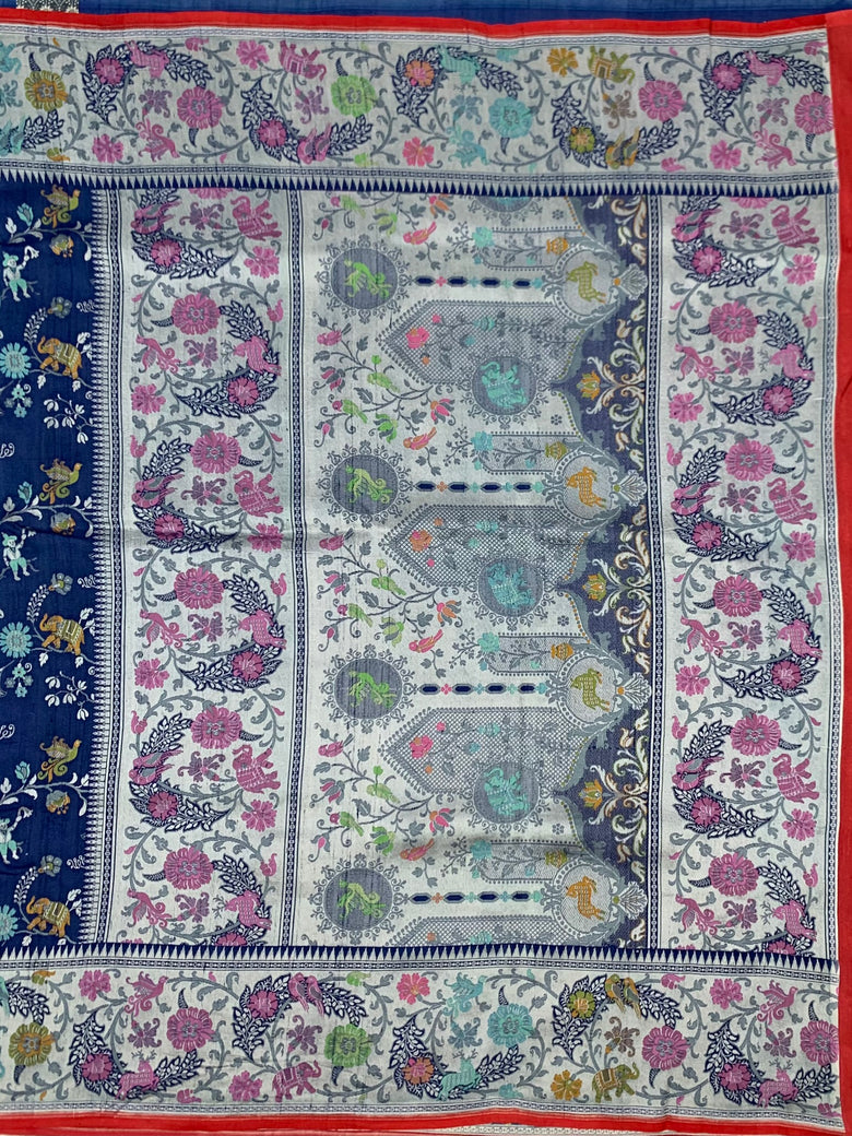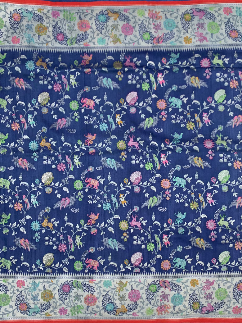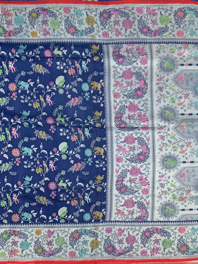 Experience the timeless beauty of Tussore Georgette Saree in a rich blue hue. Adorned with intricate silver zari and meenakari floral jaal design, along with graceful birds motif, this saree exudes elegance and sophistication. The self floral border and pallu add a touch of femininity, while the contrast plain blue blouse with zari border completes the traditional look.