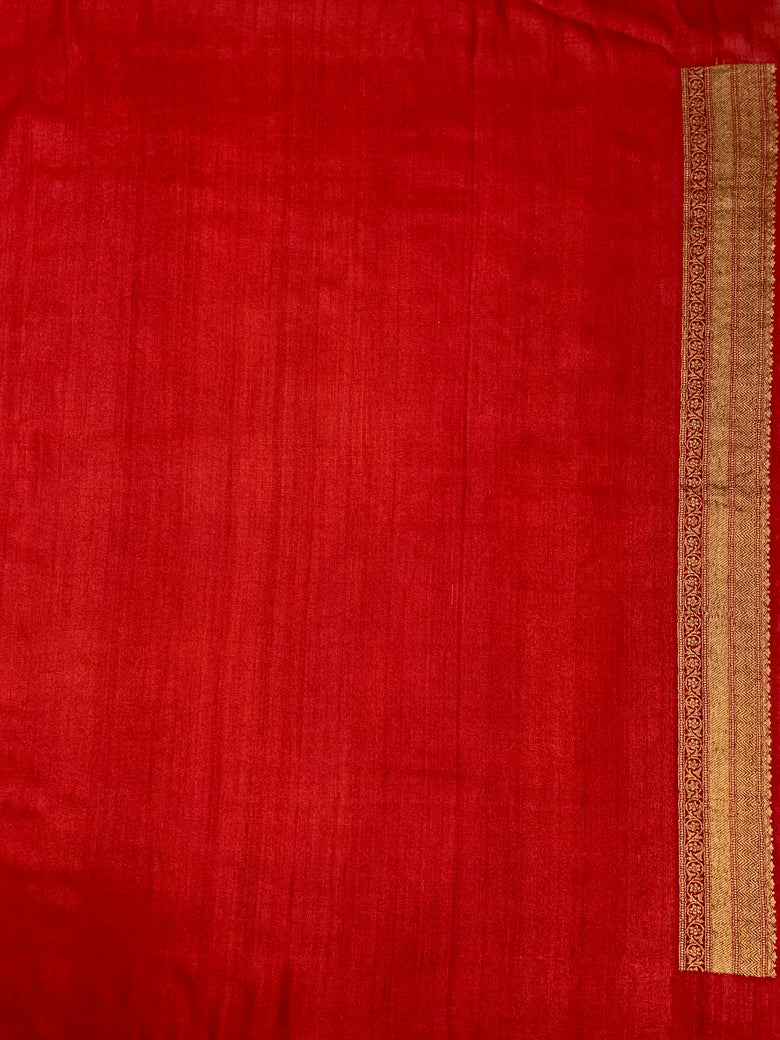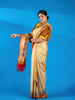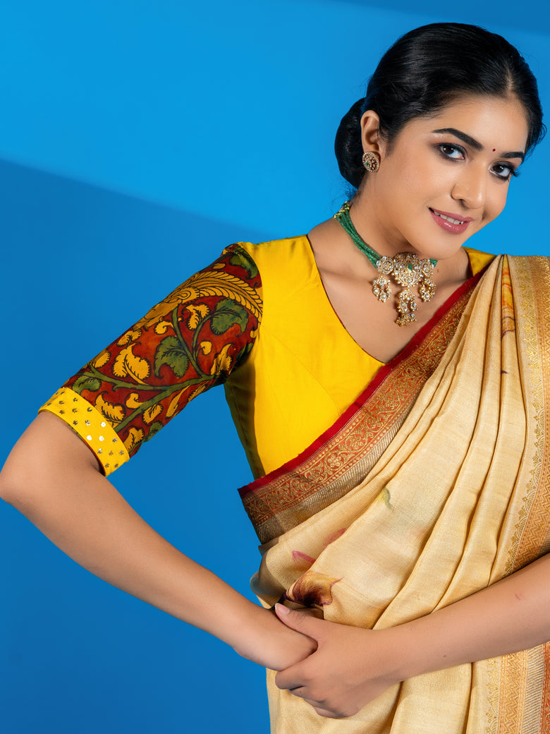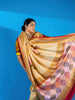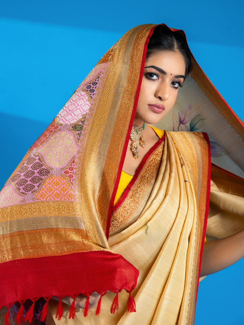 Tussore georgette saree showcases a stunning weave of brush-painted floral designs throughout. additionally, it is adorned with a contrasting floral border and a meenakari geometric pattern pallu in a cream hue. Included is an unstitched contrasting blouse piece with a border.