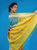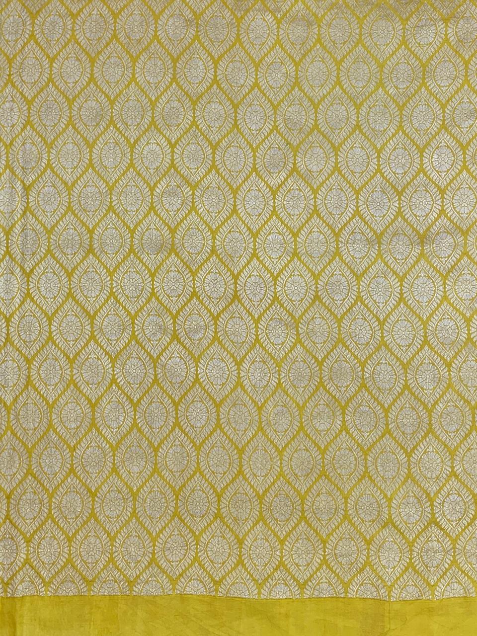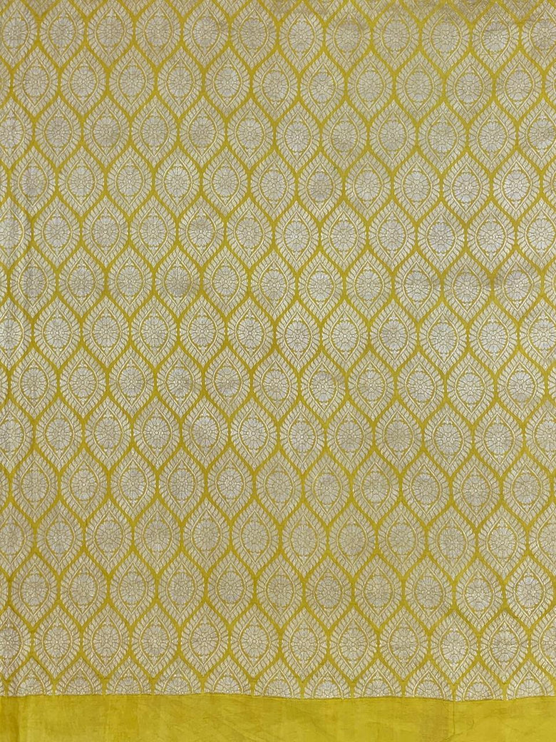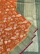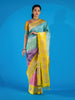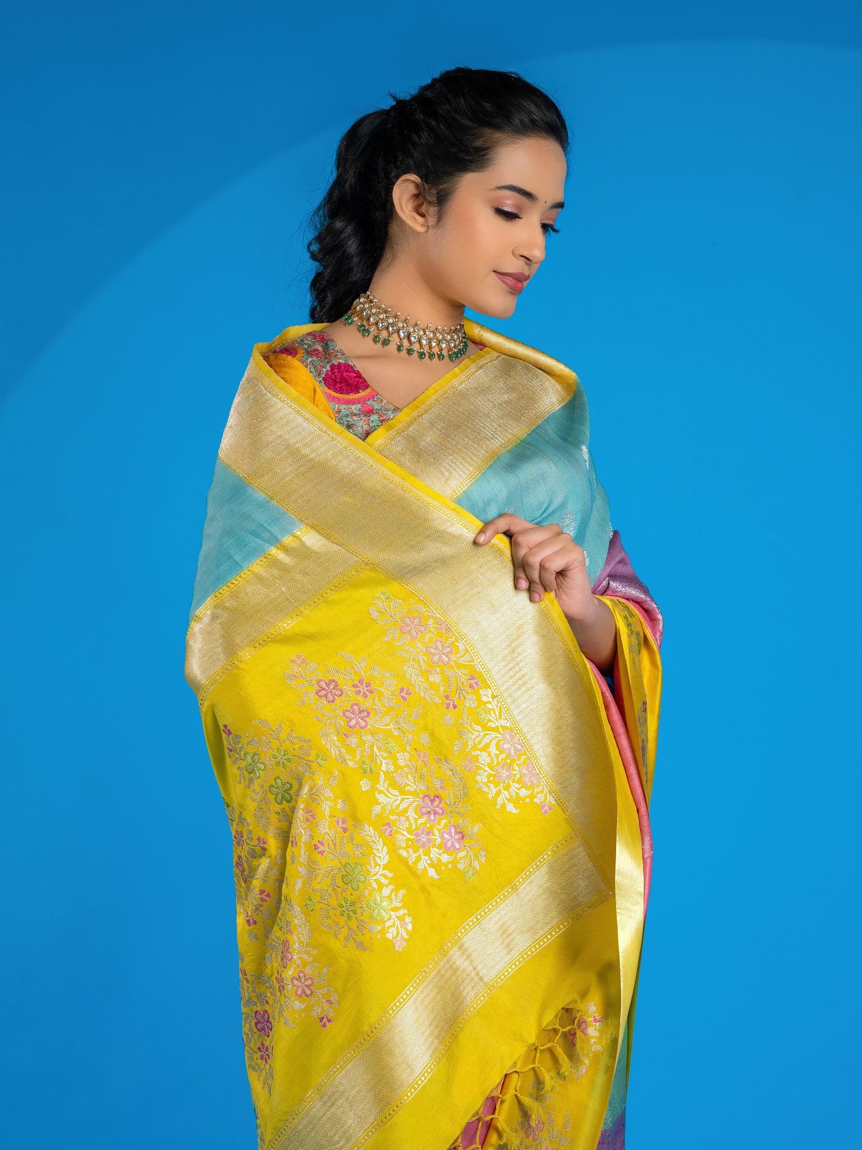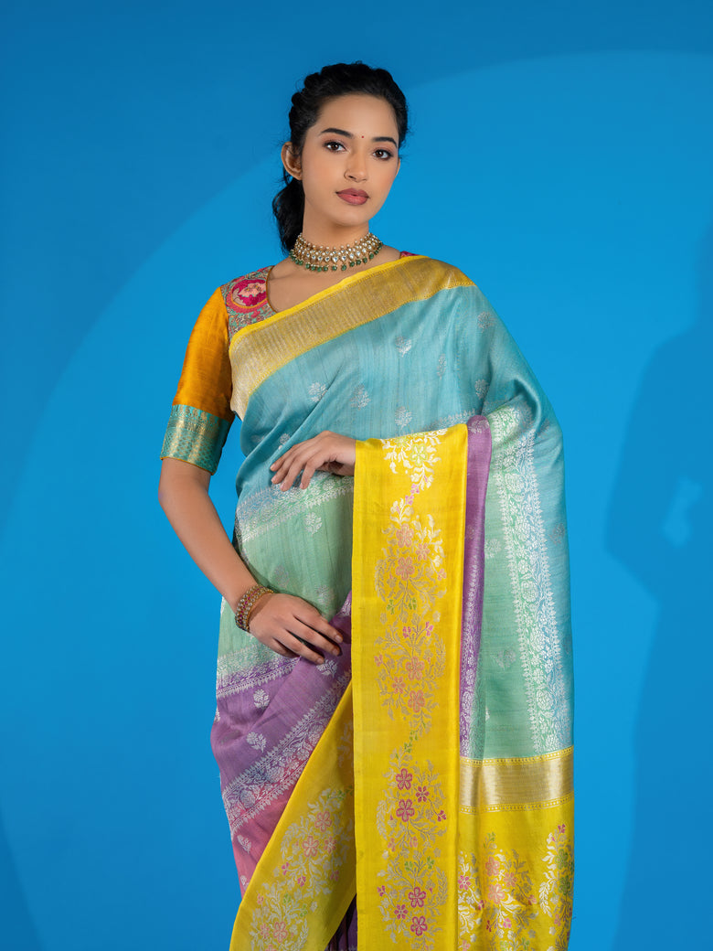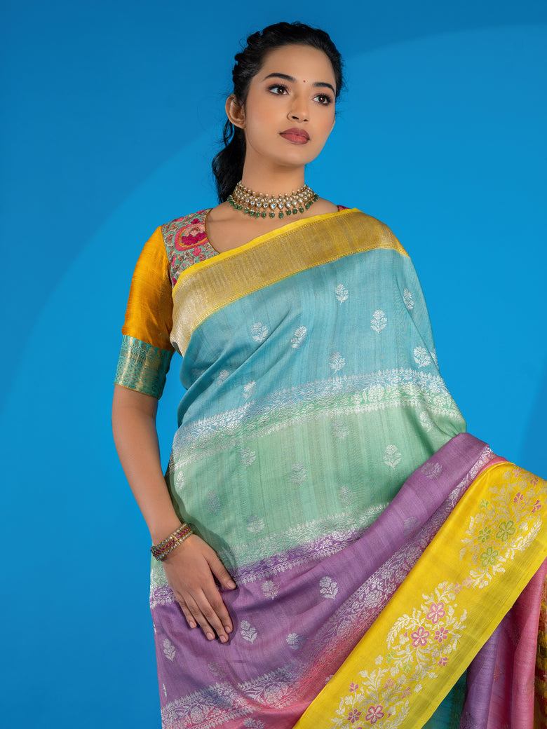 The tussore georgette saree showcases an elegant combination of silver zari stripes and a floral design, highlighted by a contrasting floral silver zari and meenakari border and pallu. Its multi-colored pattern is sure to captivate attention, and the set also includes an unstitched running silk blouse piece in a beautiful, contrasting gold zari brocade with a border.