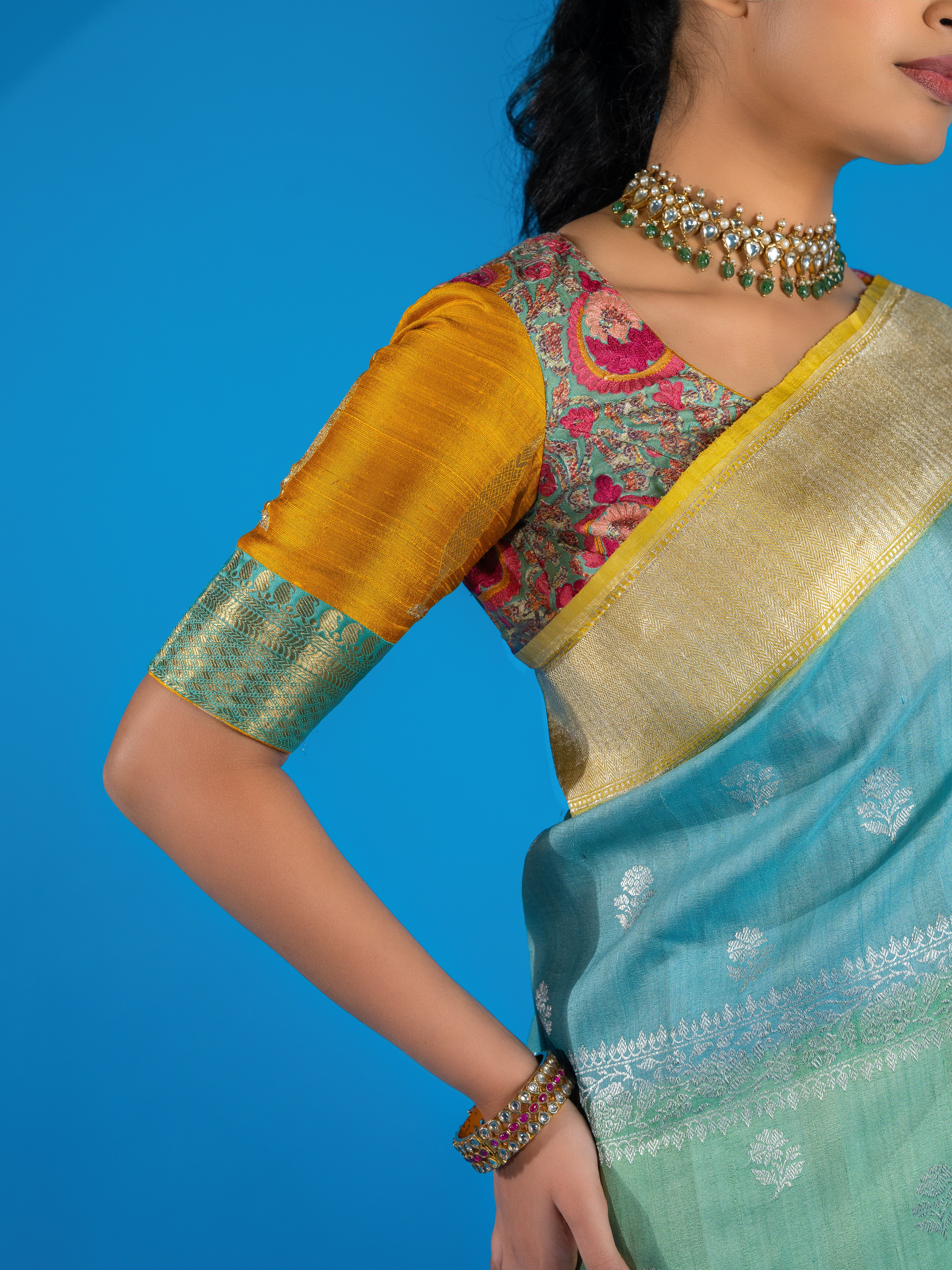 Fusion sea-green silk blouse features an intricate floral print and embroidered Work, along with a contrasting raw-silk border.