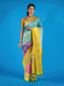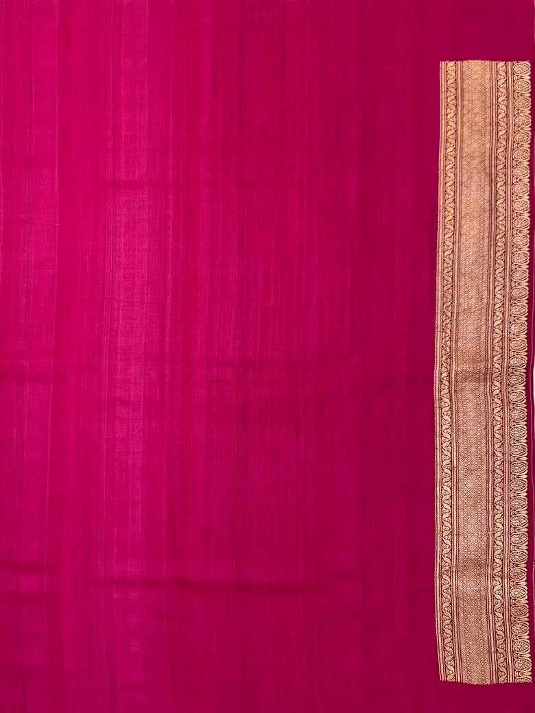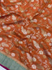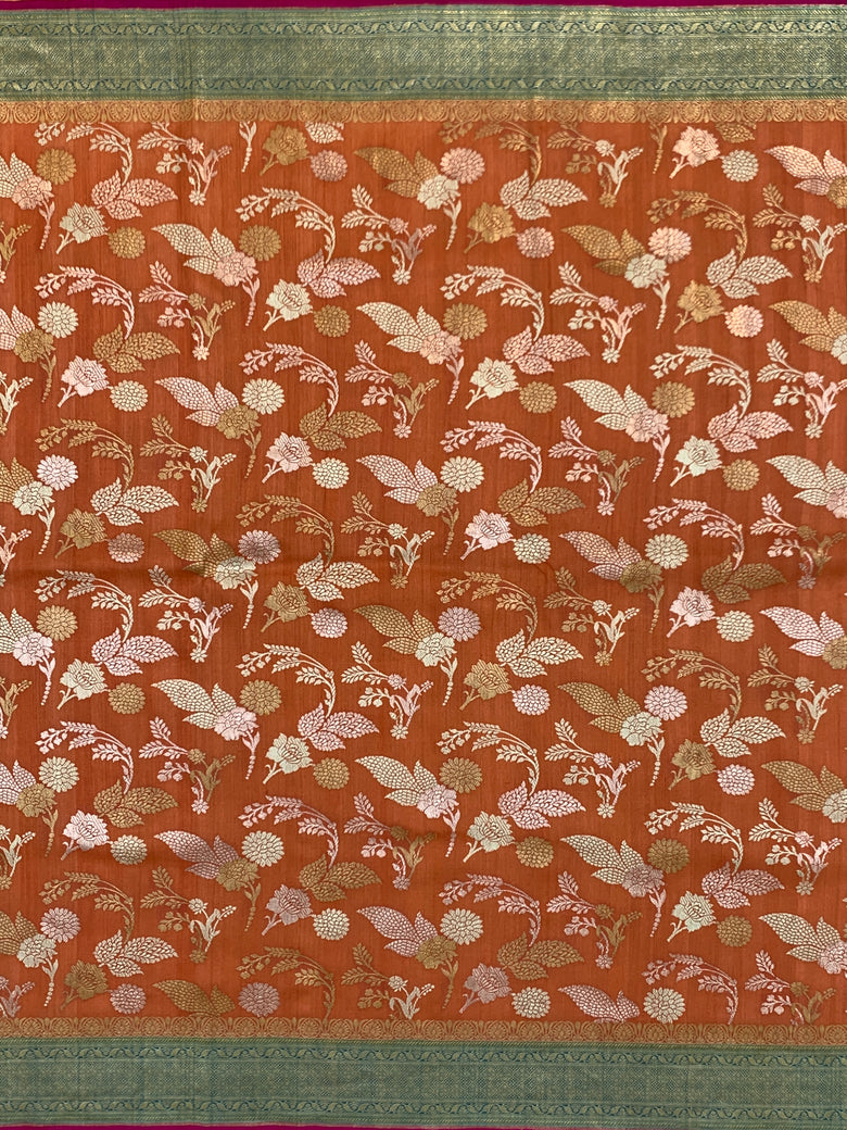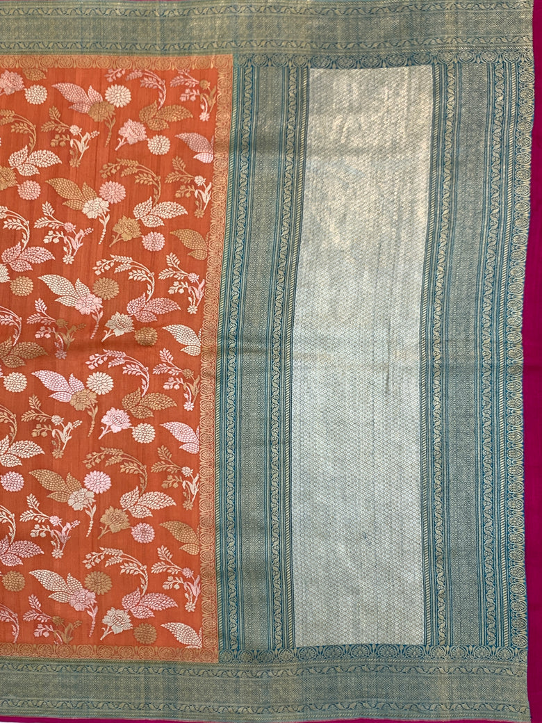 Tussore georgette saree features a stunning weave throughout, incorporating gold and silver zari and thread in a beautiful floral jaal pattern. The saree is accented with a contrasting brocade border and pallu, all in a vibrant orange hue. The accompanying blouse features a plain design with a zari border for a complementary look.