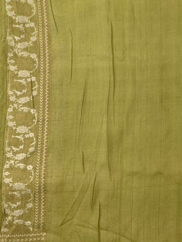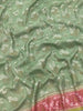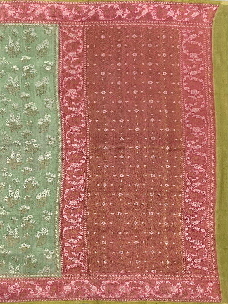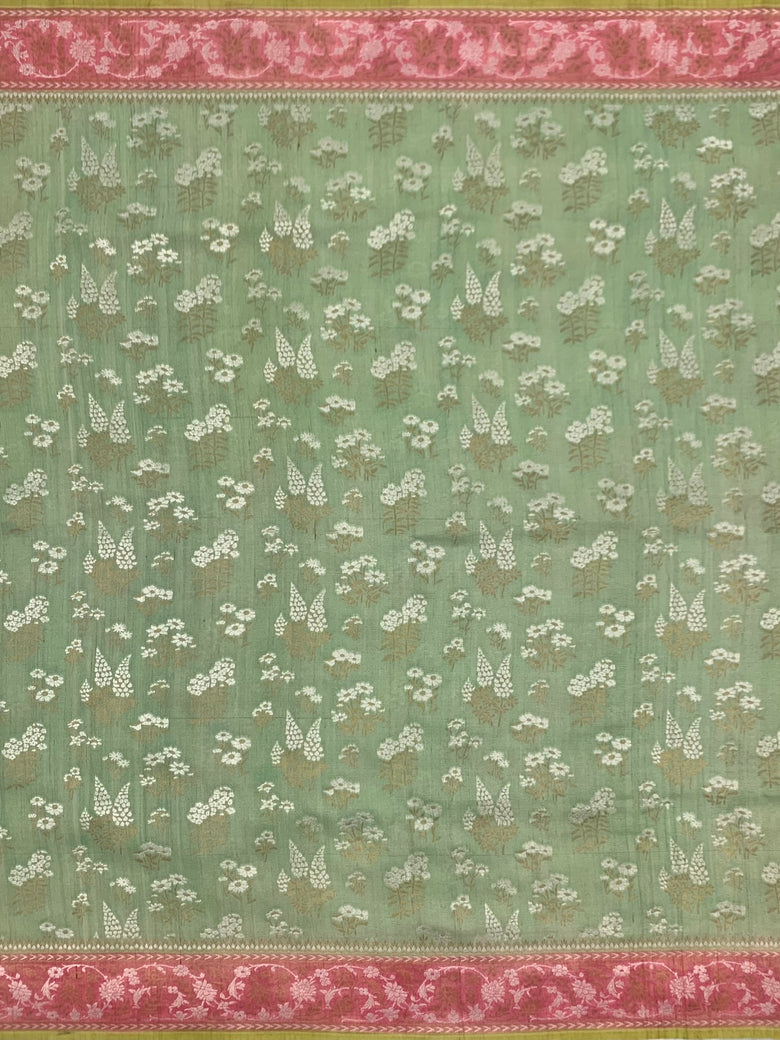 This Tussore Georgette Saree, woven with all-over gold and silver zari floral jaal, features a complementary contrast floral border and pallu. The pastel-green color adds a touch of subtle elegance. The blouse also comes with a contrasting plain design and zari border for a complete and stylish look.
