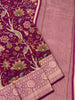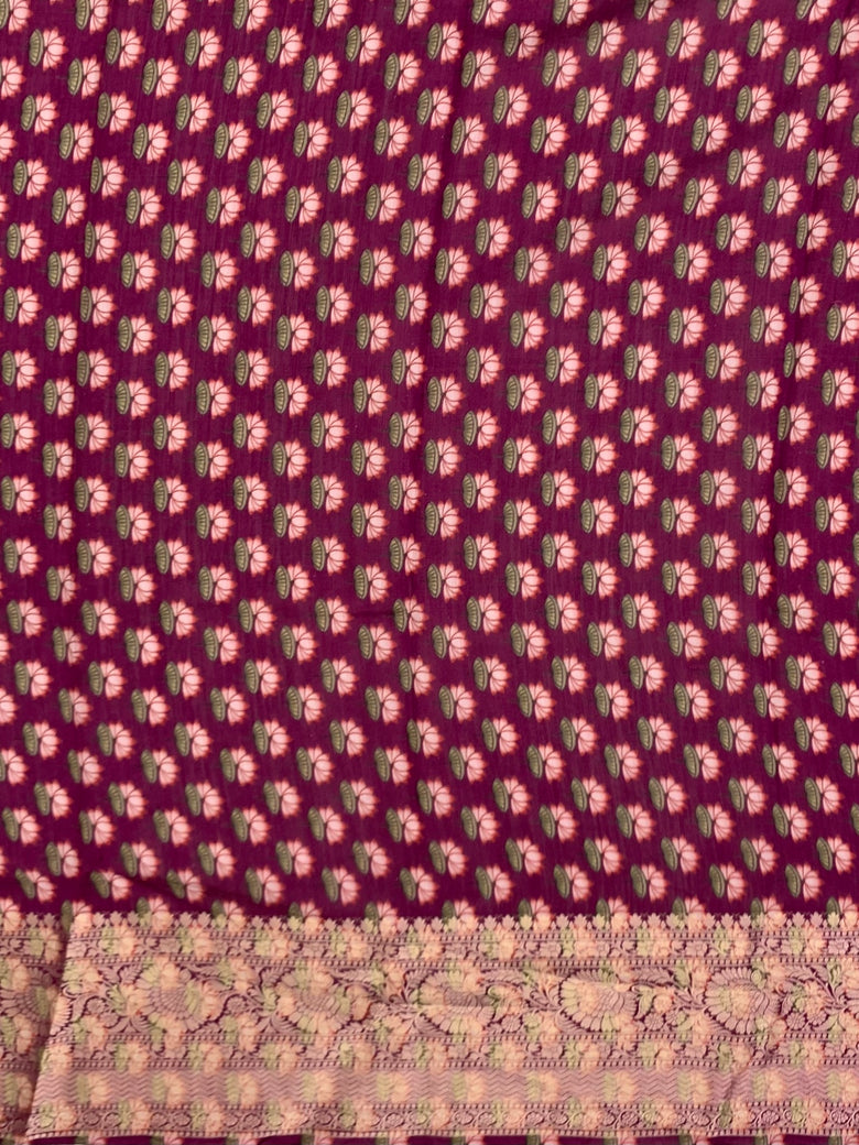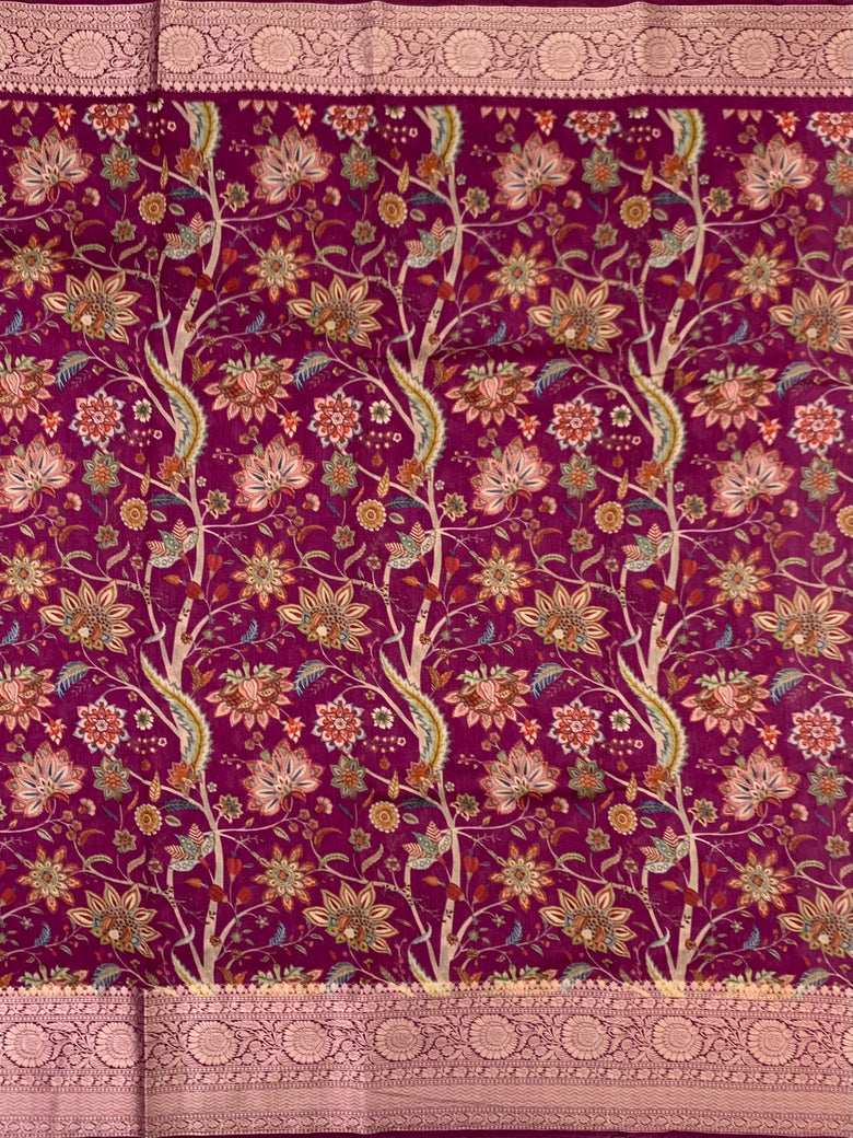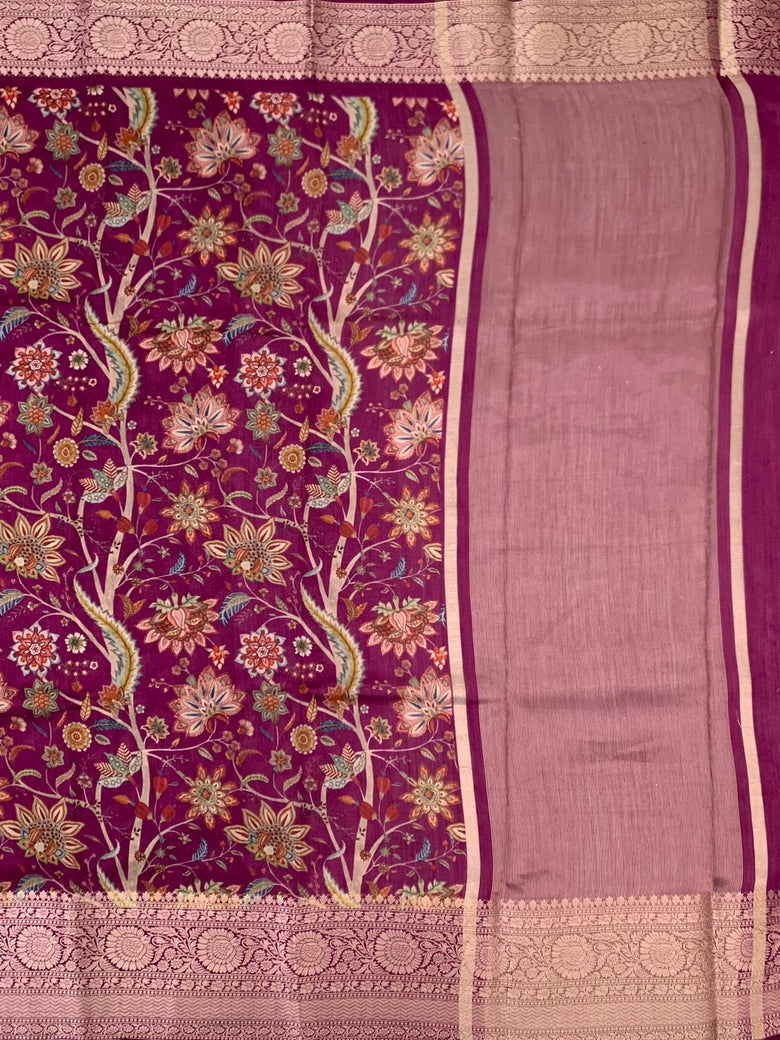 This Chiniya silk saree features a beautiful floral print throughout, as well as a zari floral border and zari stripes on the pallu. The Dark-Purple color adds elegance to the piece, and the self-printed blouse with border completes the look.