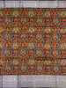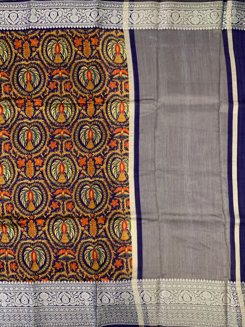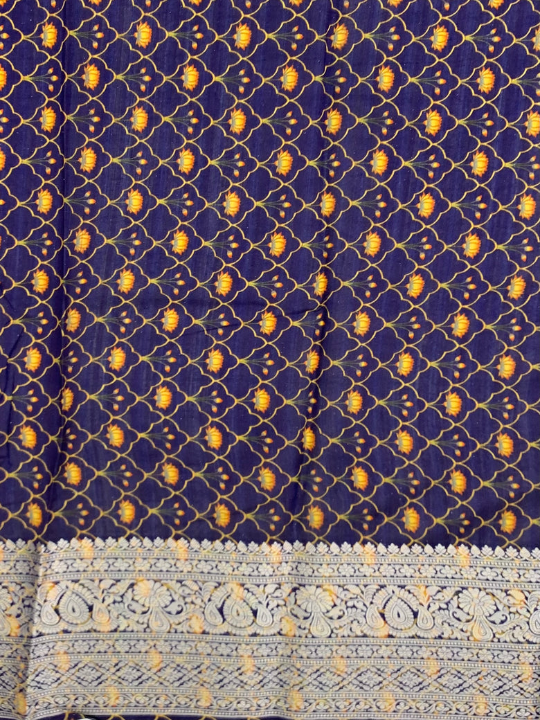 This saree is a lovely mix of a floral Printed and Geometrical pattern, highlighted by a floral zari border. The Navy-Blue colors provide a striking contrast, while the gold zari pallu adds a touch of sophistication. The included blouse with a floral border completes the look with a charming floral touch.