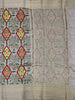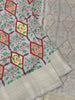 This Chiniya silk saree features a delicate weave with a combination of geometrical and floral designs throughout. The pastel-grey color is accentuated by a self gold zari floral border and zari stripes on the pallu. The blouse is a beautiful contrast with its floral print and zari border.