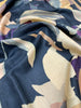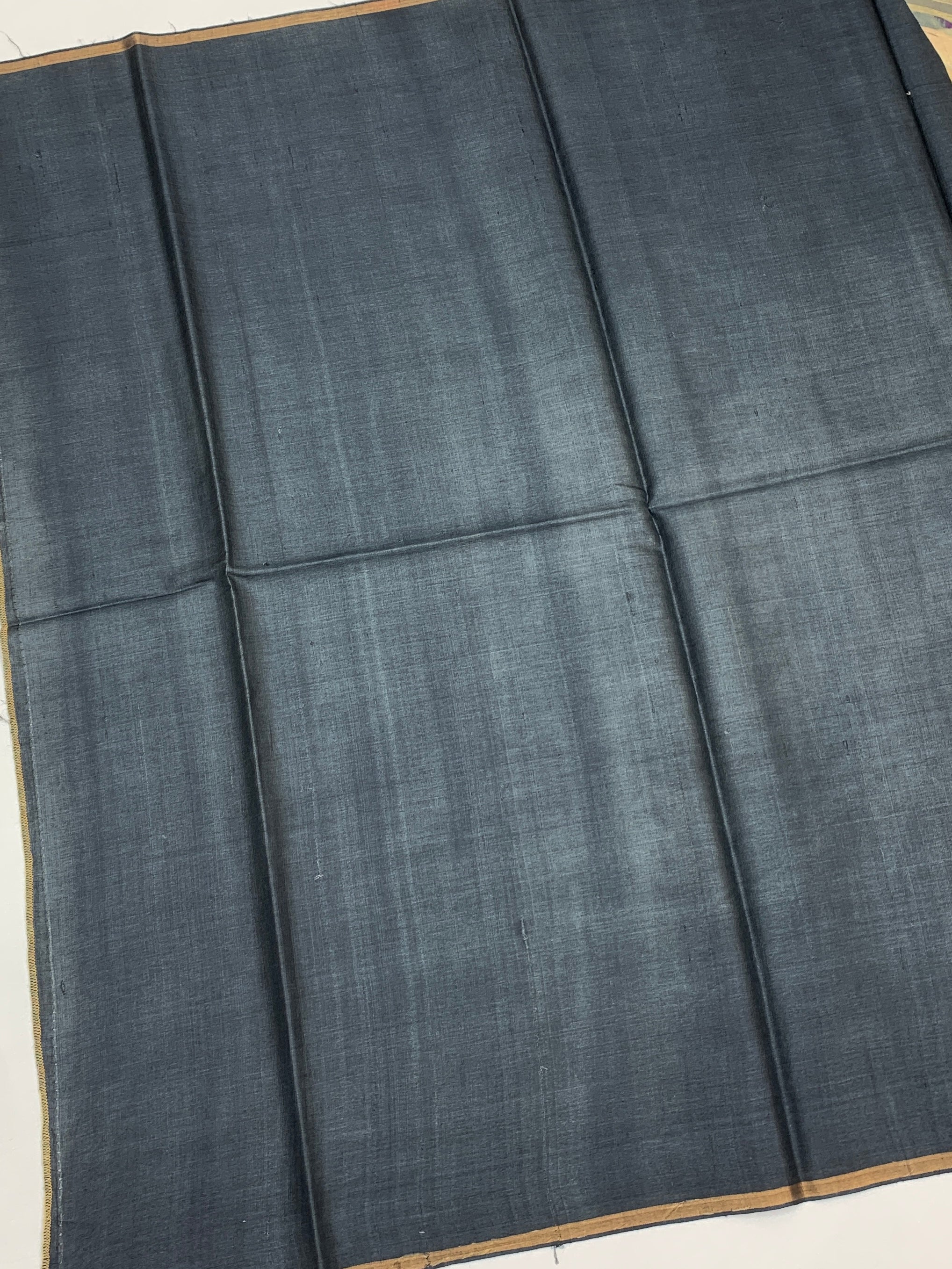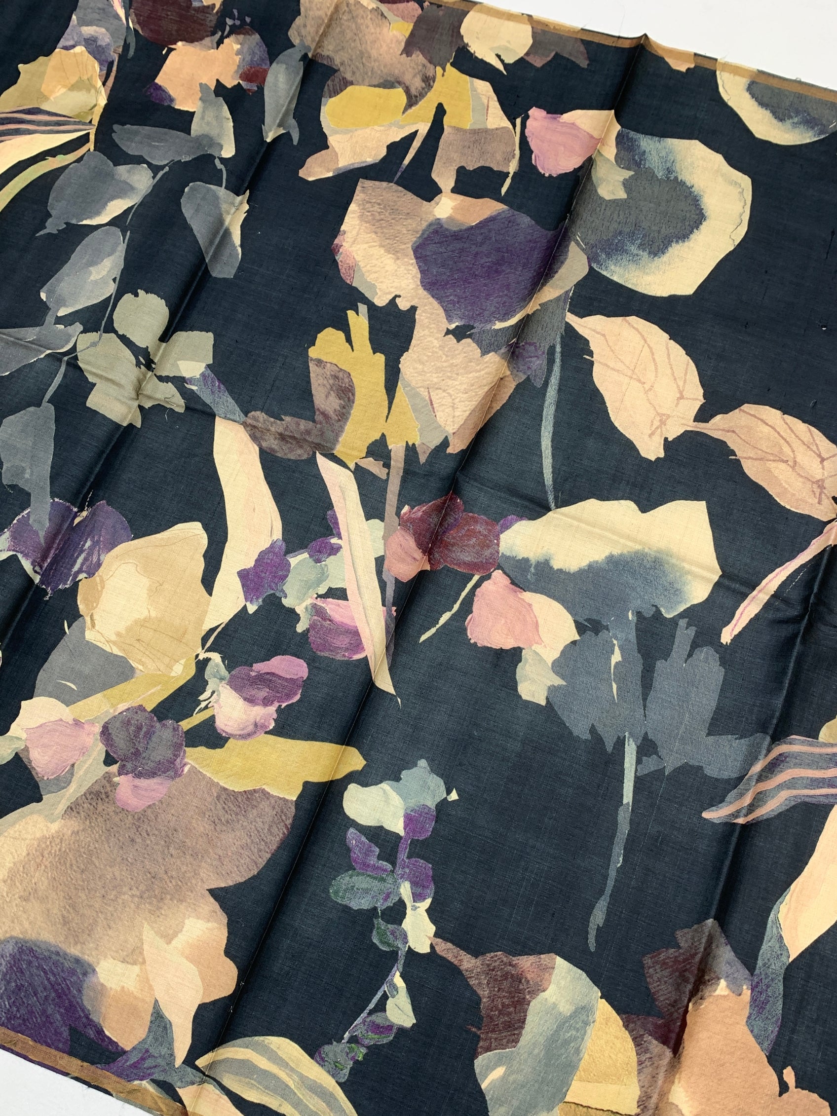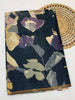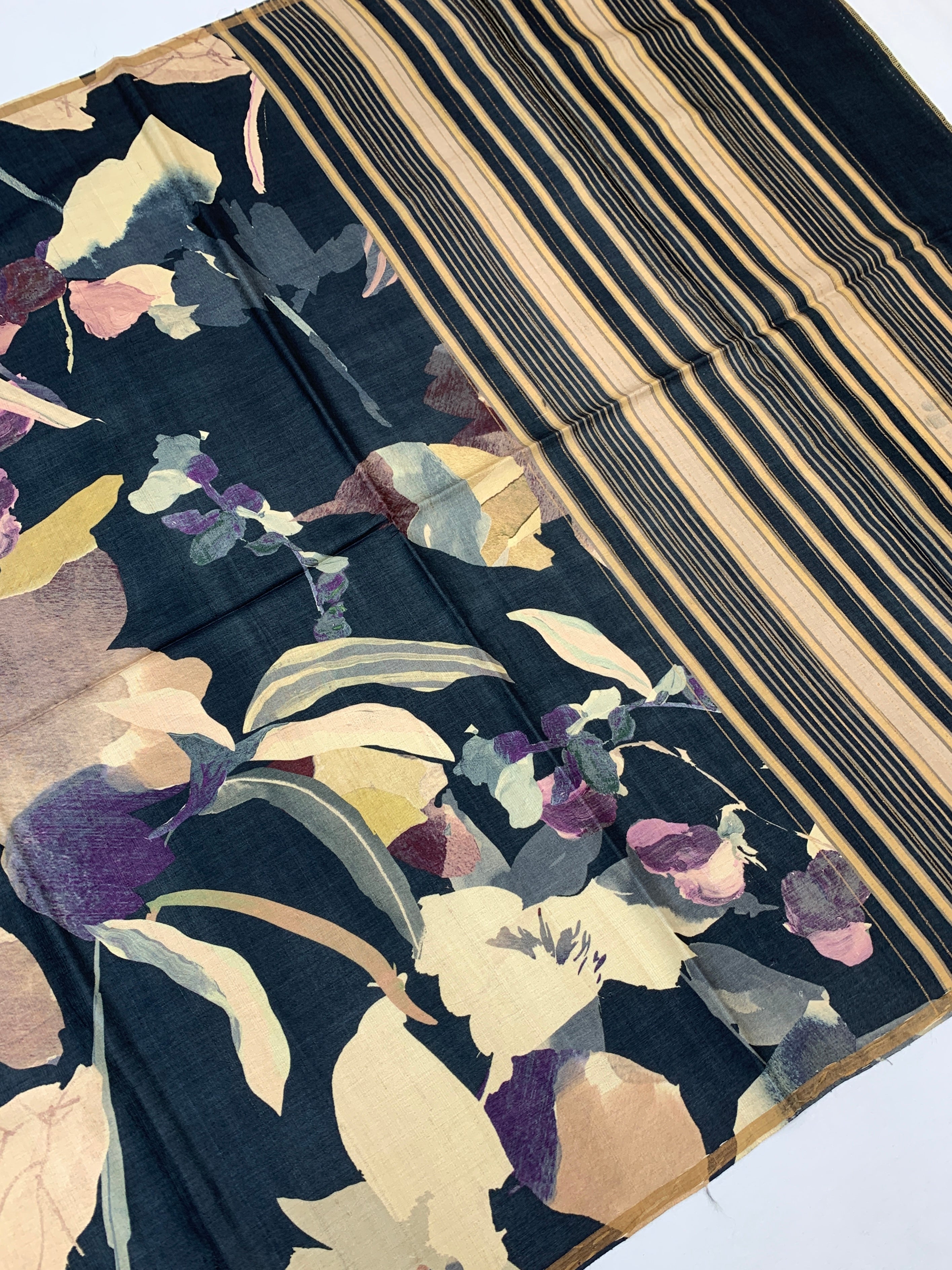 This black tussore saree features an all-over floral print with a subtle self zari border. The pallu displays contrasting stripes, complemented by a plain blouse in the same fabric with a matching border for an elegant finish.