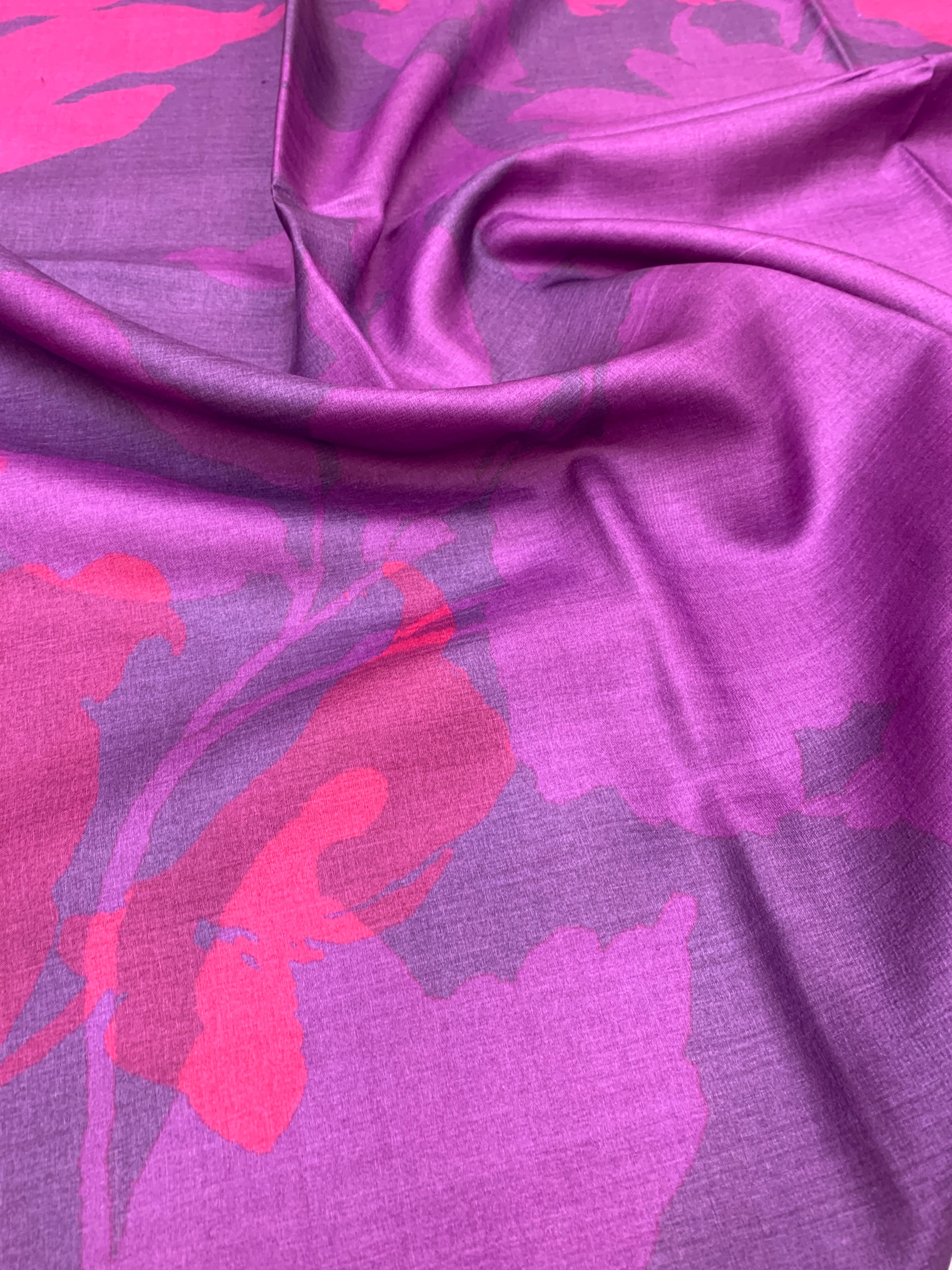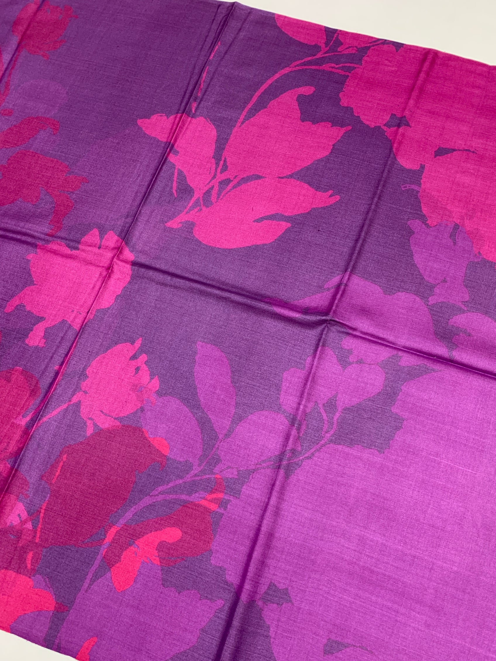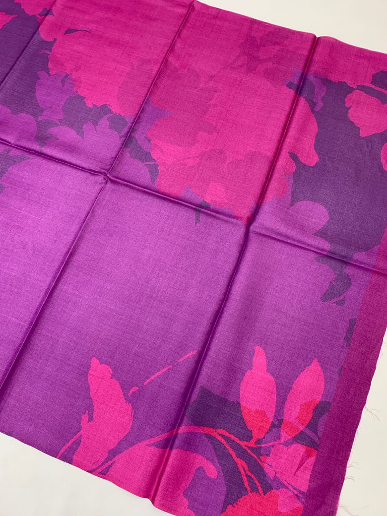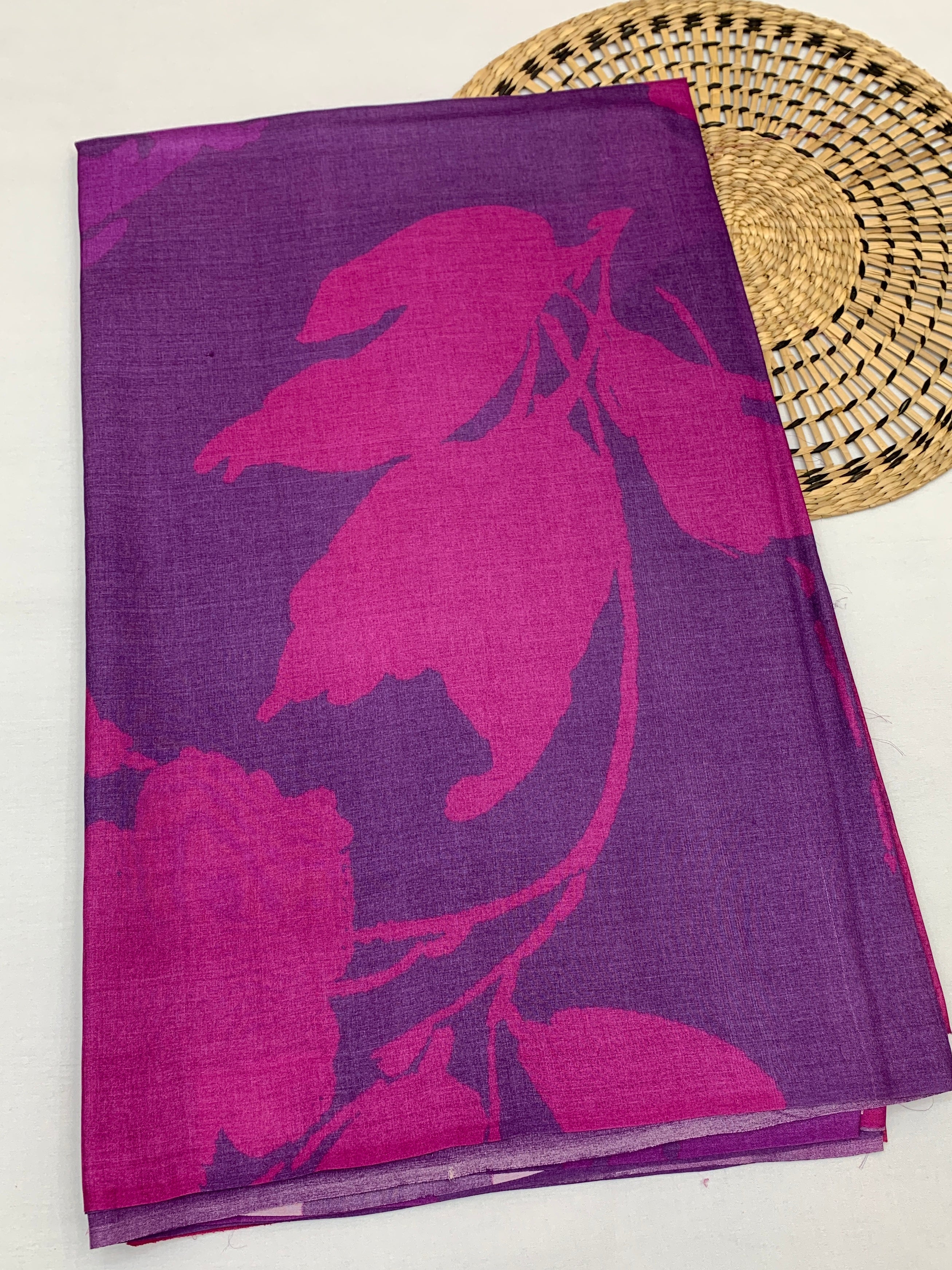 This purple tussore saree features an all-over multicolor floral print with a matching self-floral pallu. It is complemented by a contrasting floral printed blouse, creating a harmonious and elegant ensemble.