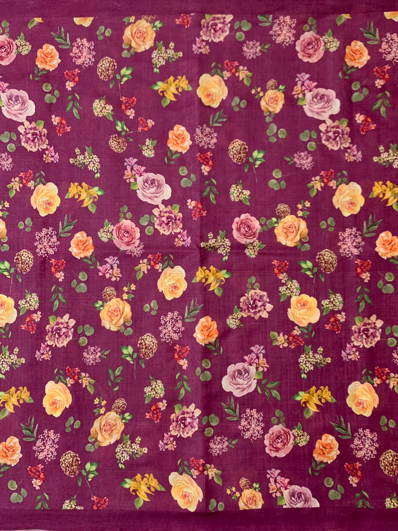 This Tussore Printed silk saree showcases a versatile multi-colour floral pattern on the entire fabric, complemented by a contrasting plain border and pallu. The Magenta-Pink hue exudes sophistication, while the self floral Printed blouse adds an extra touch of elegance.