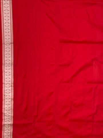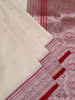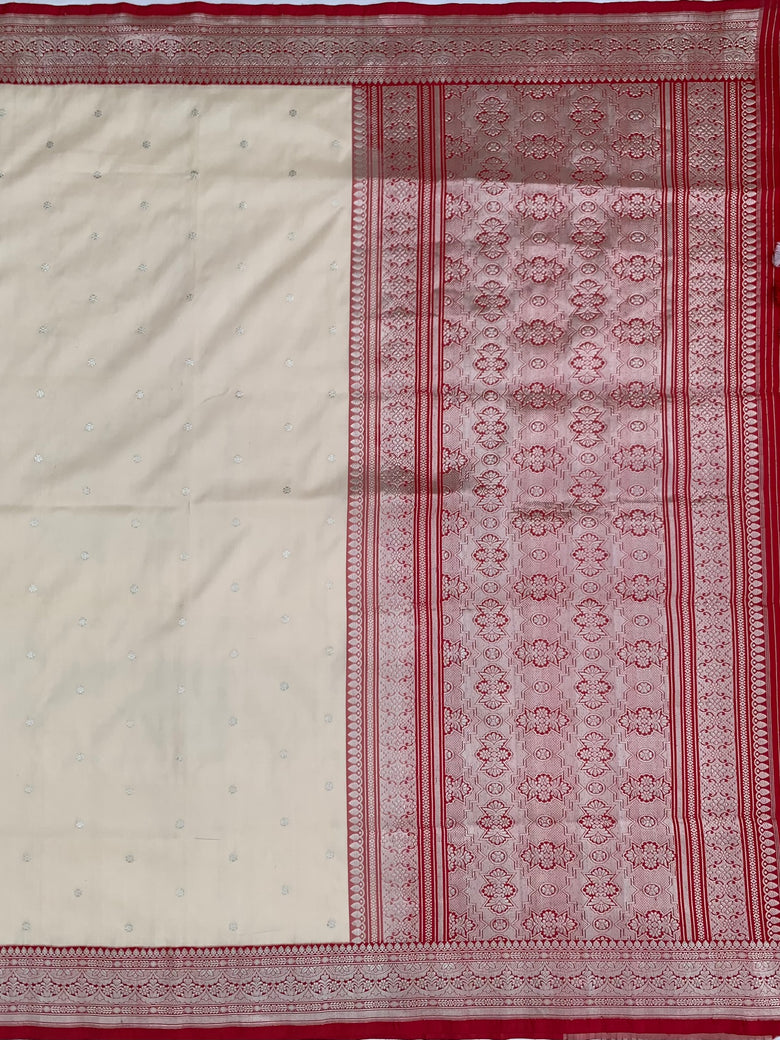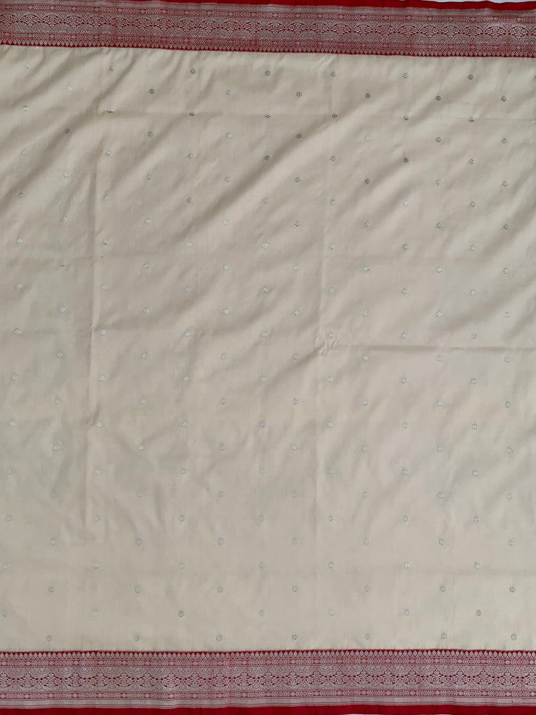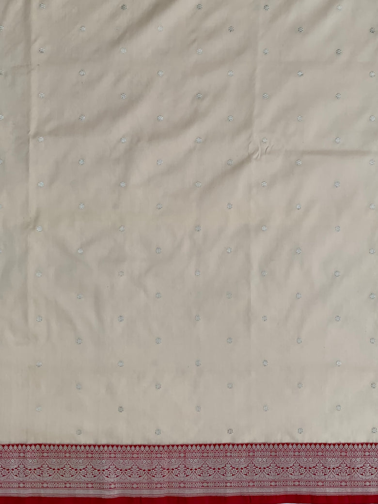 Banarasi Silk Kadwa Butta Cream Saree Captivates Attention With Its Silver Zari Flower Butta All Over. The Delightful Weave Is Beautifully Complemented By A Contrast-Zari Border With Silver Zari Floral Design. This Saree Has A Contrast Pallu With Silver Zari Floral Vines And Comes With A Red-Blouse With Zari Border.
