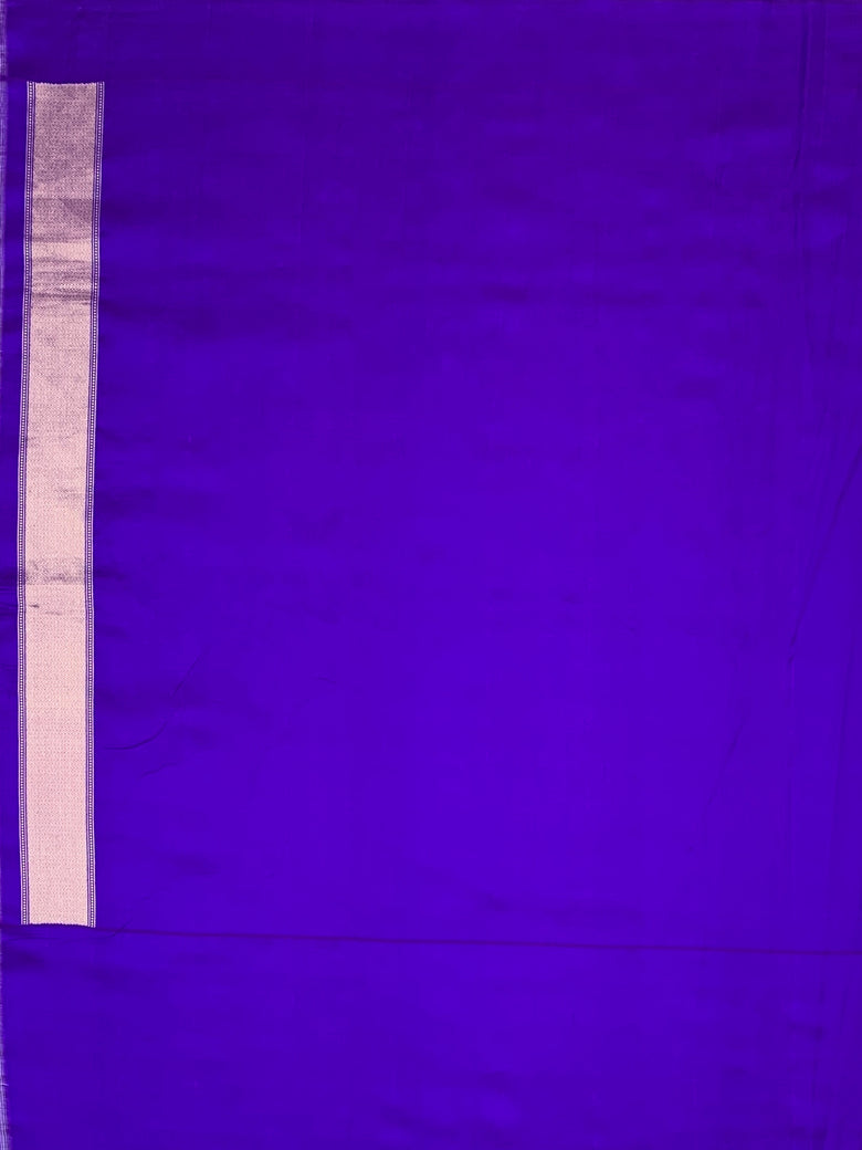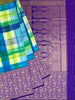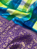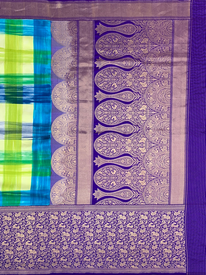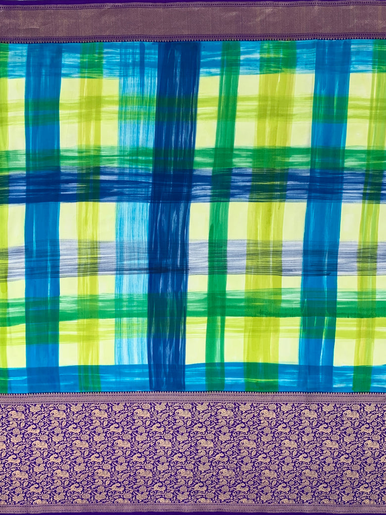 This Banarasi brush painted saree showcases expert handwoven artistry with a detailed multi-colored brush paint checks pattern across its body. The elegant gold zari border and pallu feature distinctive animal motifs, Dominated by vibrant multi-colors with subtle yellow highlights, it is paired with a purple plain blouse trimmed with a zari border.