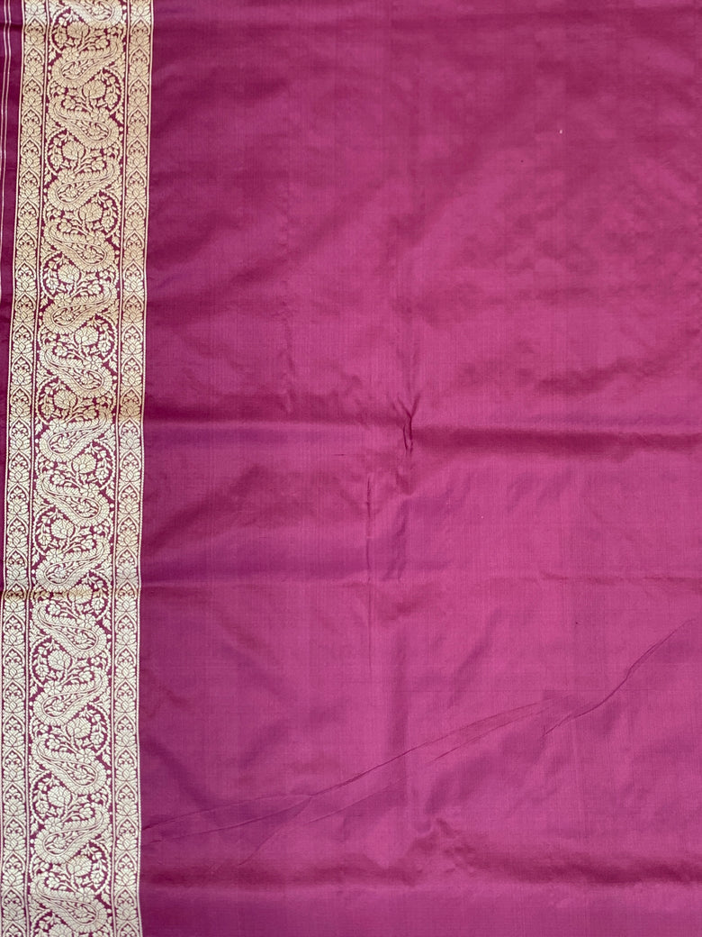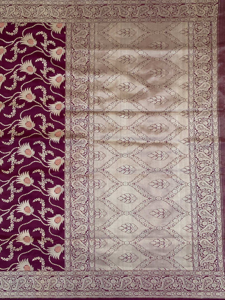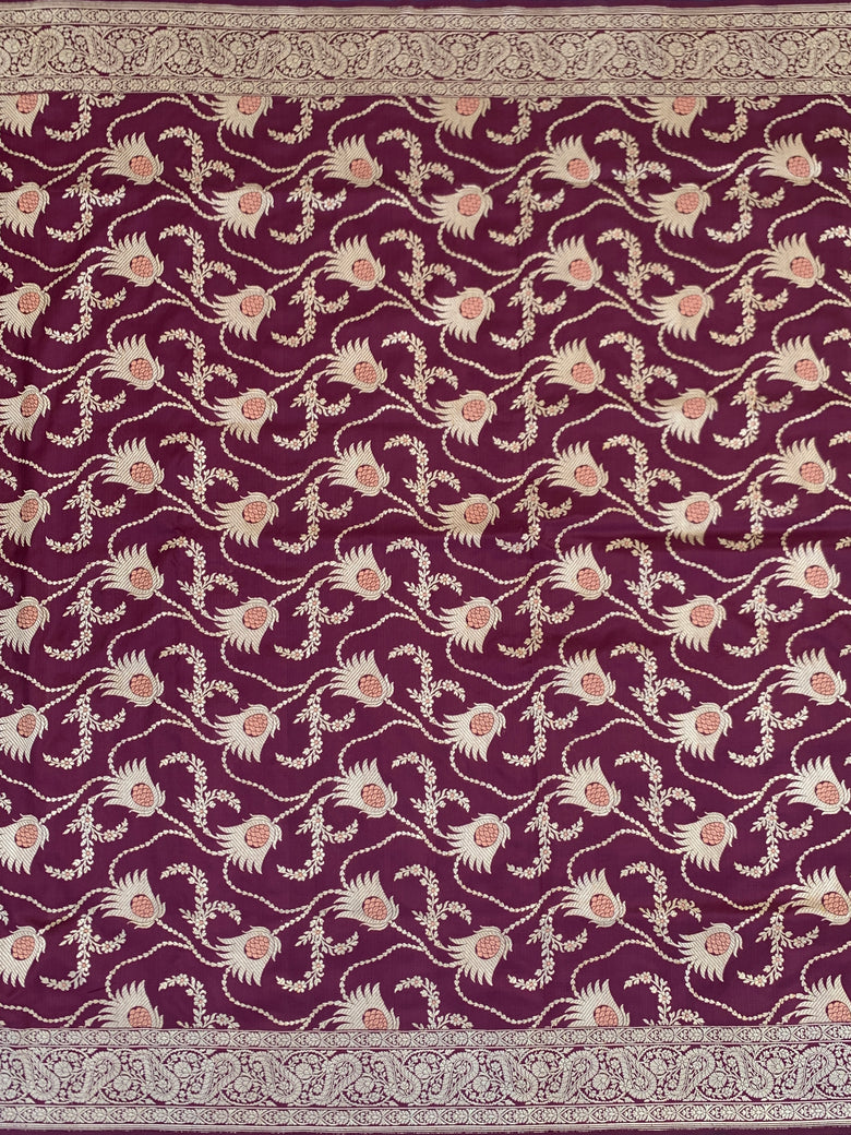 This Banarasi kadwa silk saree showcases a beautiful gold zari floral jaal with meenakari design on its body. The saree is accented by a self zari floral border and a geometrical design pallu in a dark-maroon color. The blouse is plain with a floral border, completing the elegant look.