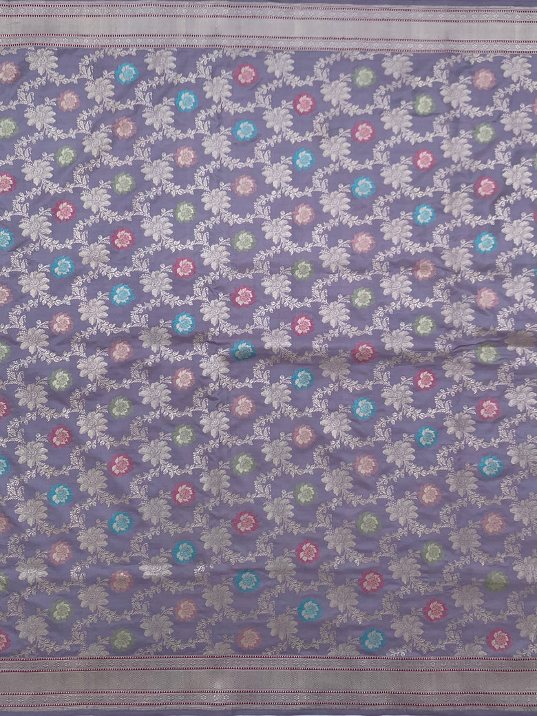 This exquisite Banarasi Kadwa Weave Silk Saree features a charming All-over design of gold zari and meenakari bail jaal on the saree self brocade border, alongside a floral pallu. The color of this saree is a graceful Light-Lavender, complemented by a self plain blouse with a zari border.