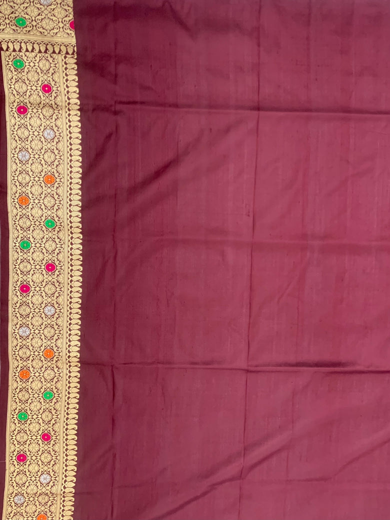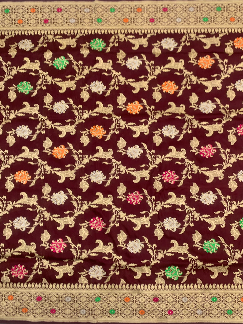 This brown Banarasi Kadwa Weave Silk Saree features stunning Gold & Silver zari work, including a beautiful jaal and meenakari pattern. The saree also includes a self border and brocade pallu, and is paired with a simple blouse featuring a zari border.