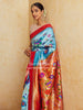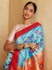 Discover the elegance of our Allover Paithani Silk Saree in a beautiful light-blue hue. Adorned with a intricate gold and silver zari weave, and embellished with a floral jaal design featuring meenakari detailing. The saree's palla showcases a stunning floral pattern.