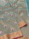This Tissue Zari Kota Saree showcases a sophisticated blend of gold and silver zari throughout the all-over design. The geometric pattern and meenakari floral butta add intricate detailing, while the contrasting border and brocade pallu elevate its elegant appeal. In a stunning Lilac color, the saree is accompanied by a blouse adorned with a gold zari geometric design, silver zari birds motif butta, and a zari border.