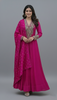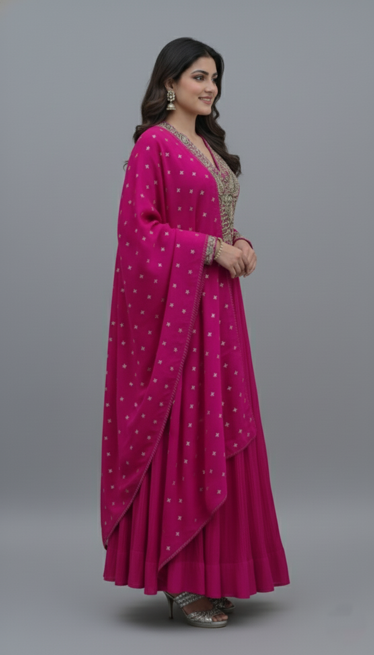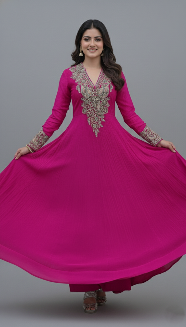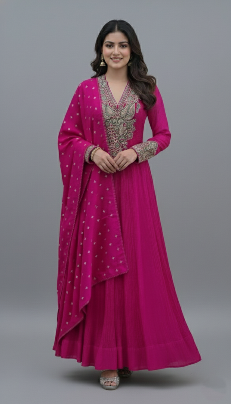 Bedecked paisley anarkali suit set is crafted with crushed fabric and adorned with embellished paisley motifs on the decolletage and cuff edges. The set includes a fully embellished Anarkali suit with full sleeves, a pant, and a minimally embellished dupatta. The embellishments feature multi-colored thread work, dabka, cheed, pearls, and sequins for a stunning finish.