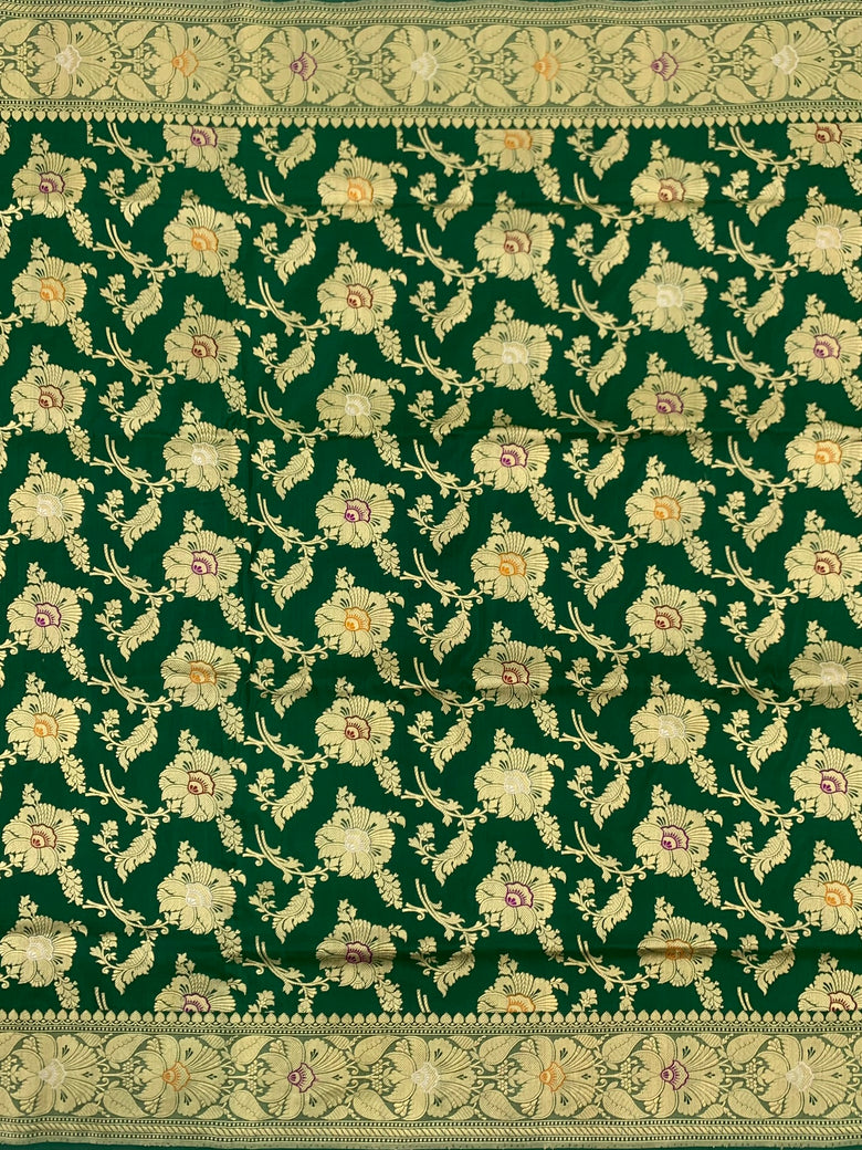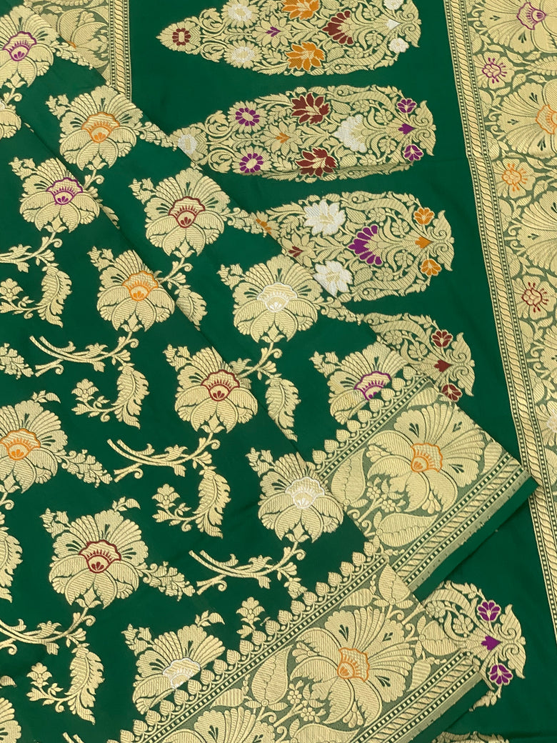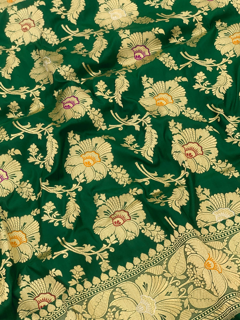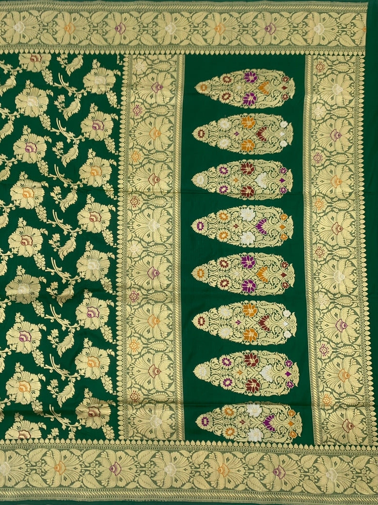 This elegant Banarasi Kadwa Weave Silk Saree is adorned with intricate gold, silver zari and meenakari floral designs throughout the fabric, with a matching self floral border and pallu. The stunning bottle-green color adds a touch of sophistication to the saree, while the self plain blouse features a zari border for a cohesive look.