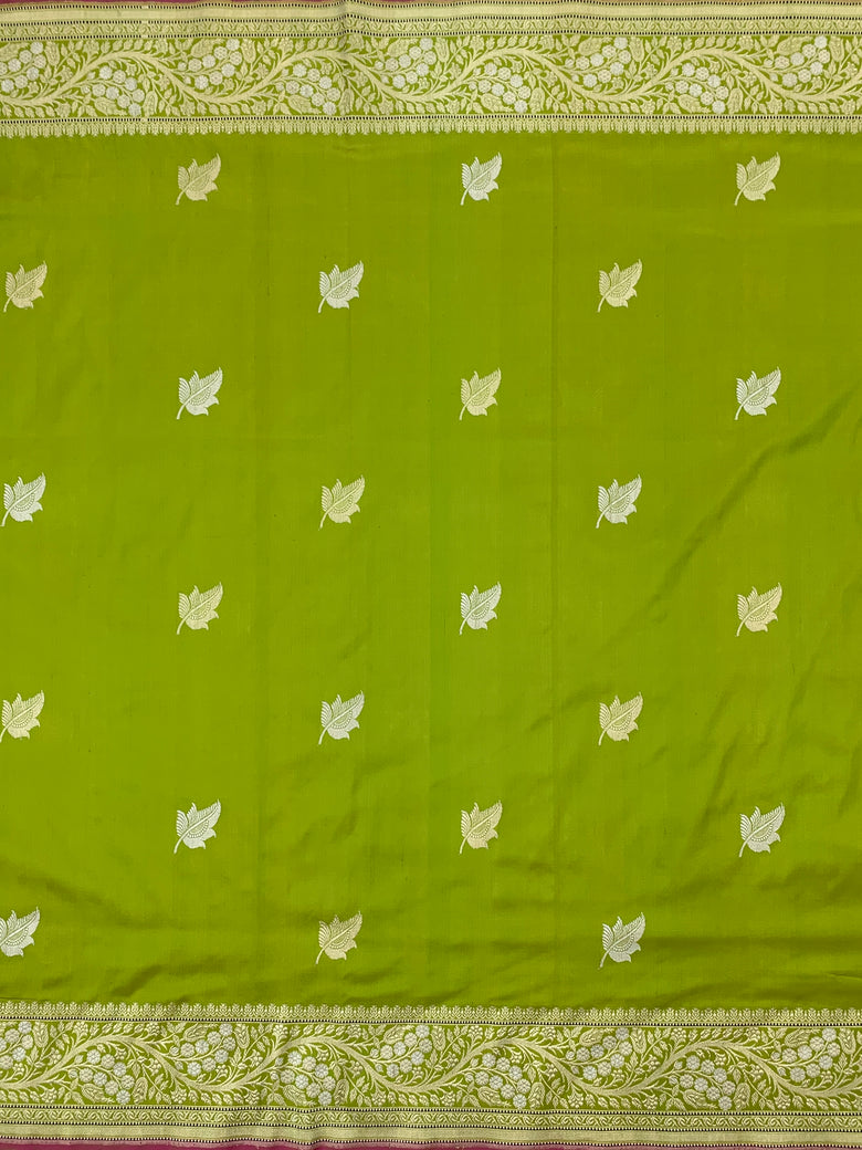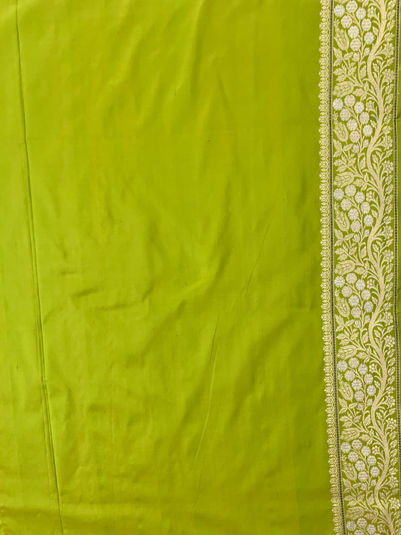 This Banarasi Kadwa Weave Silk Saree offers a stunning mix of vivid green and mustard tones enabled by the gold and silver zari leaf butta, complementary floral border, and brocade pallu. The coordinating self plain blouse is complete with a border finish.