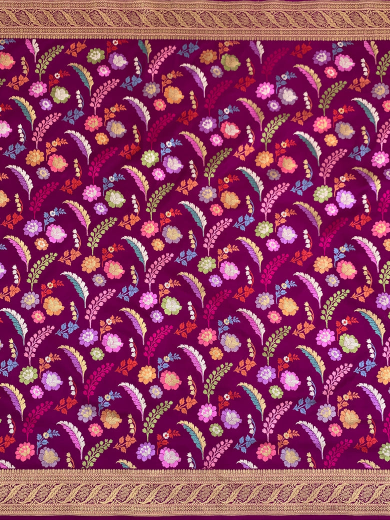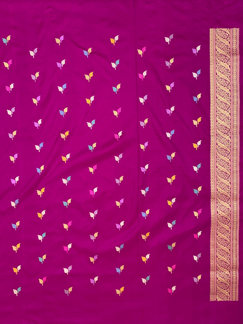 Banarasi kadwa weave silk saree features an intricate meenakari floral jaal pattern throughout. It is adorned with a self gold zari floral border and a richly brocaded pallu. The saree comes in a striking magenta-pink shade, complemented by a blouse embellished with self leaf buttis and a matching border.