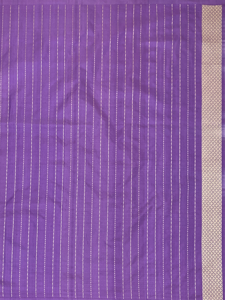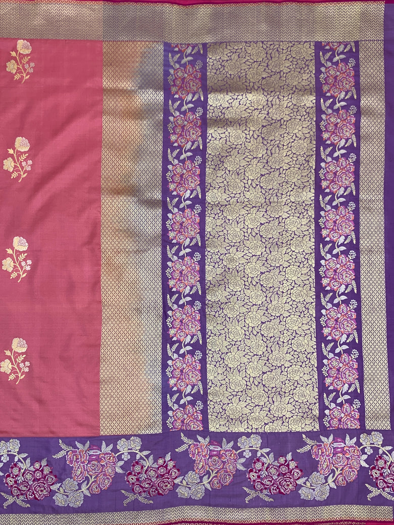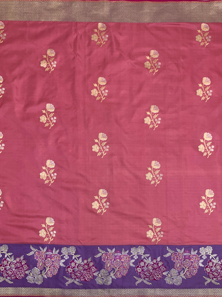 Banarasi kadwa weave silk saree features intricate gold and silver zari floral buttis throughout. It is adorned with a contrasting meenakari floral border and a richly brocaded pallu. The saree comes in a delicate peachish-pink shade, paired with a blouse showcasing contrasting stripes and a matching border.