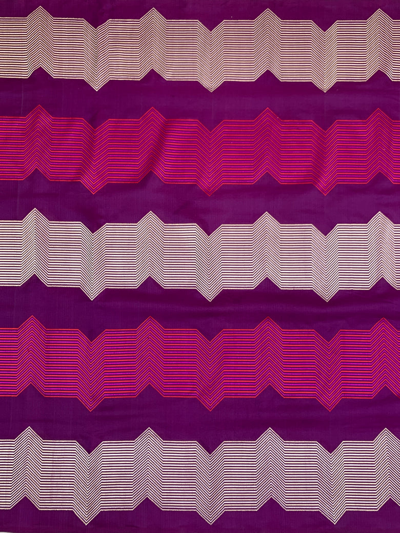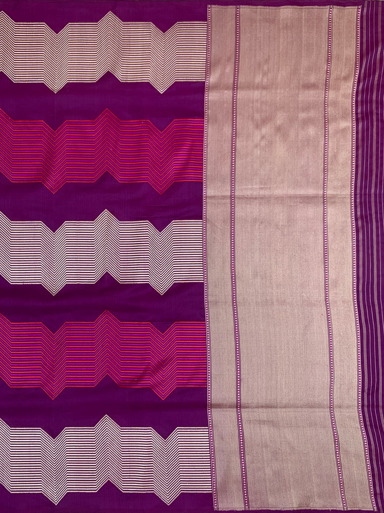 Banarasi kadwa weave silk saree features an intricate all-over gold and silver zari thread geometric pattern. It comes without a border and showcases a self-brocade pallu in a rich purple hue. The accompanying blouse is plain with a matching border, completing the elegant ensemble.