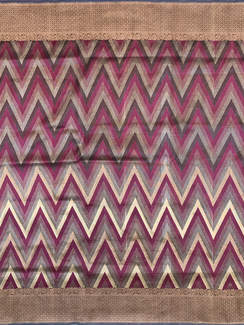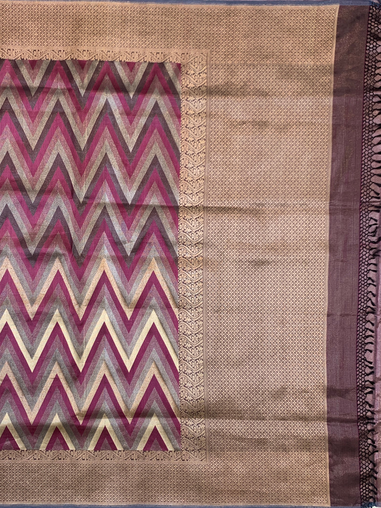 This exquisite banarasi saree features a rangkat kadwa weave in silk, with a stunning gold, silver, and meenakari zig-zag pattern all over the fabric. It is accented with a contrast brocade border and pallu, adding a touch of elegance to the multi-colored design. The blouse is made of plain tissue and features a zari border, completing the overall look of the saree.