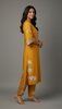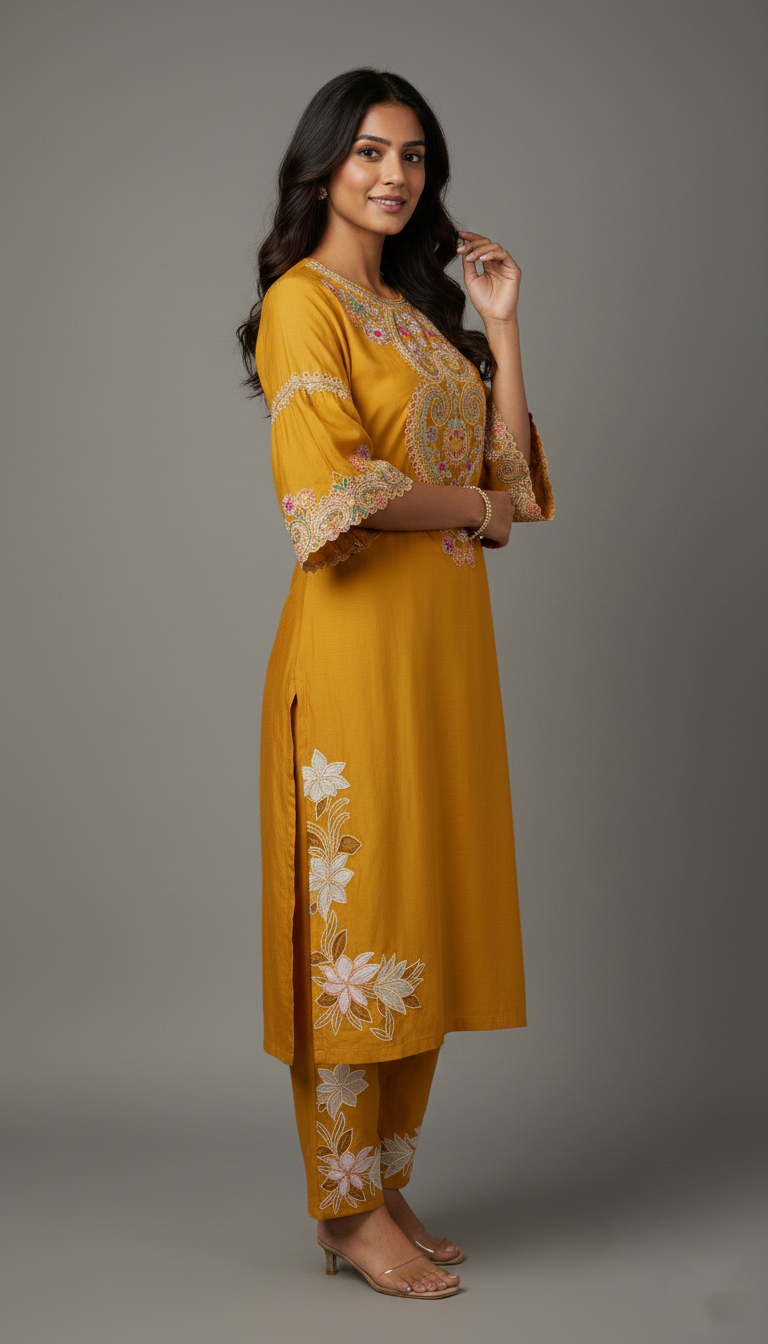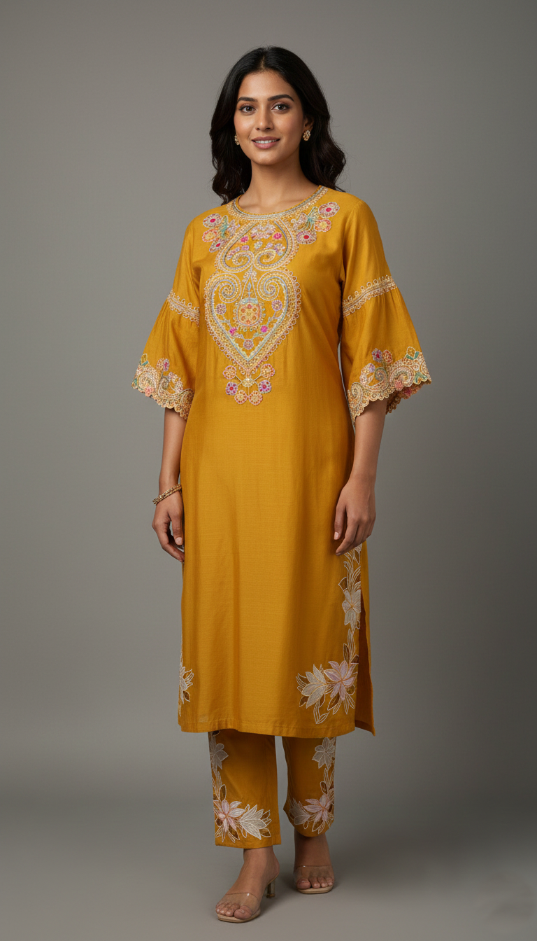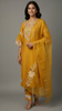The Chanderi Silk Straight Cut Set in a beautiful mango-yellow color features a unique pearl weave and a floral cut work design on the dress. The accompanying bottom is made with a self floral fabric, while the dupatta is crafted from cut work kora fabric and embellished with a delicate lace border.