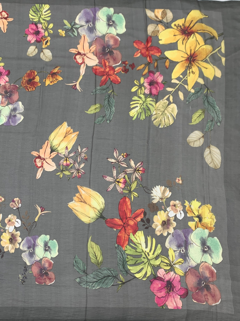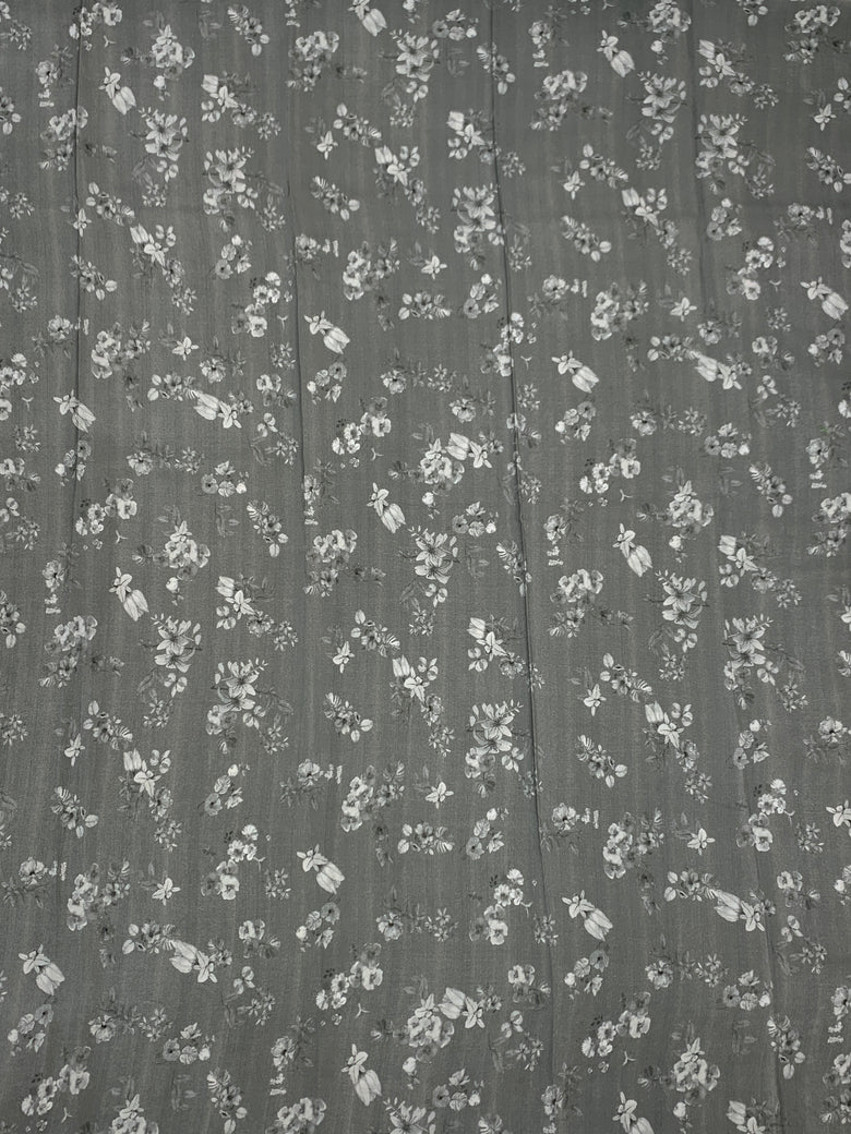 This dark-grey chiffon saree features an elegant floral digital print throughout, complemented by a subtle border and pallu. It comes with a matching self-printed crepe blouse, offering a graceful and comfortable ensemble for any occasion.